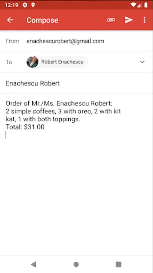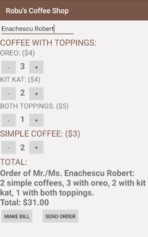 This is a simple application where you can enter your name, you can pick what coffee you like and by clicking the "Send Order" button, you will be redirected to send the order via e-mail. (Also, all fields will be autocompleted in the mail)
