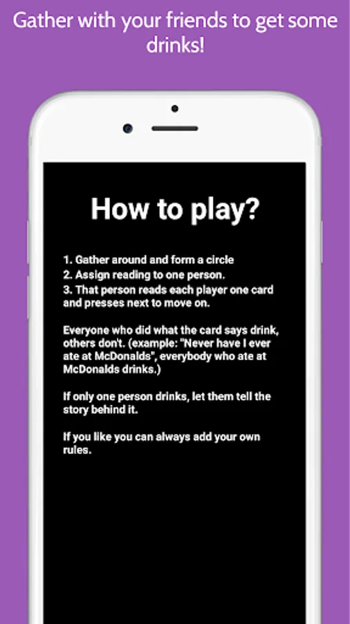 Never Have I ever is an excellent drinking game where you and your friends answer questions that the game offers you and have a few drinks while you're around it!
