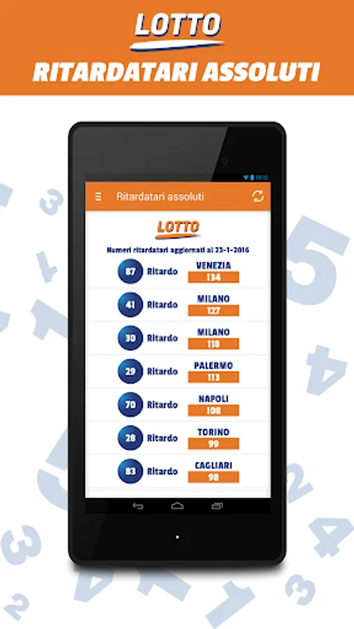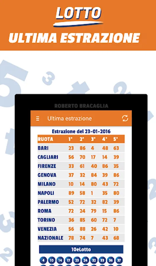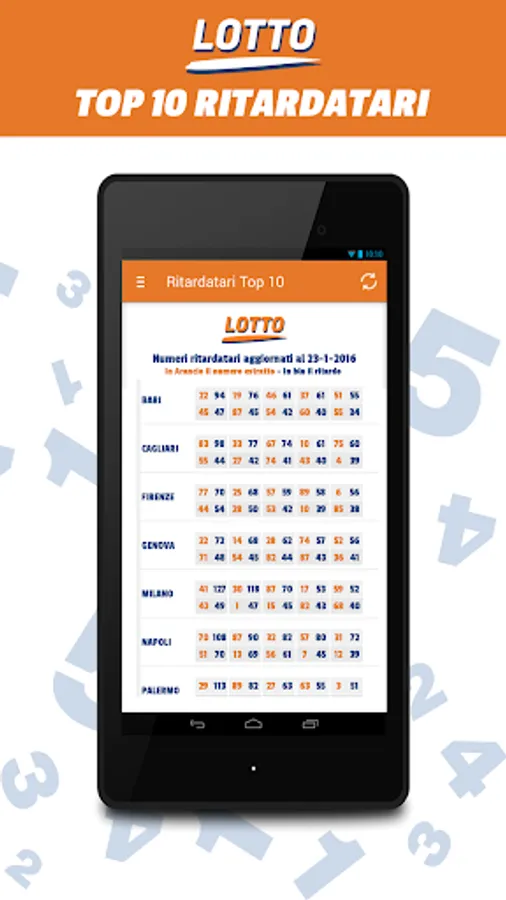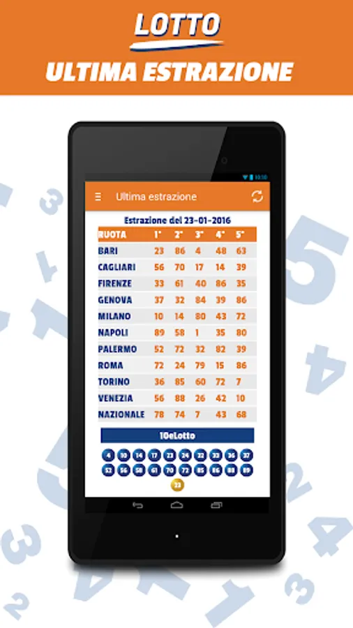 The ten latest numbers of the Lotto game, with the indication of the wheel to which they refer.