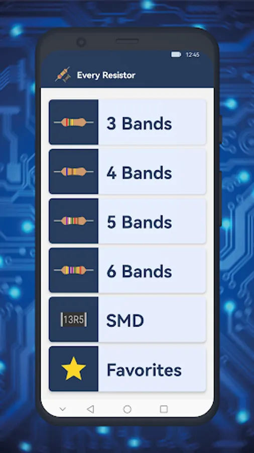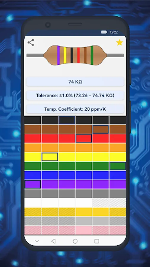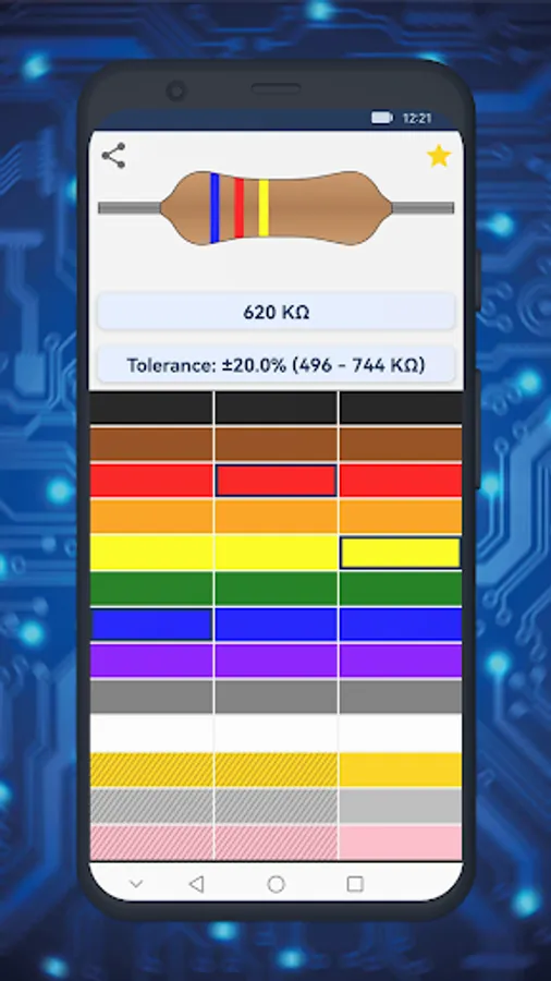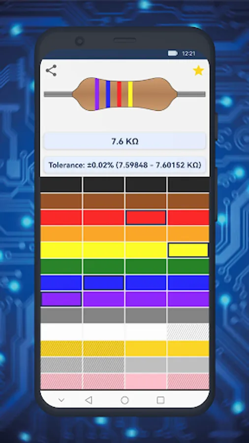 Our app simplifies the calculation of resistors with 3, 4, 5, and 6 bands, providing results in ohms, as well as their tolerance and temperature coefficient.