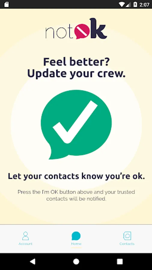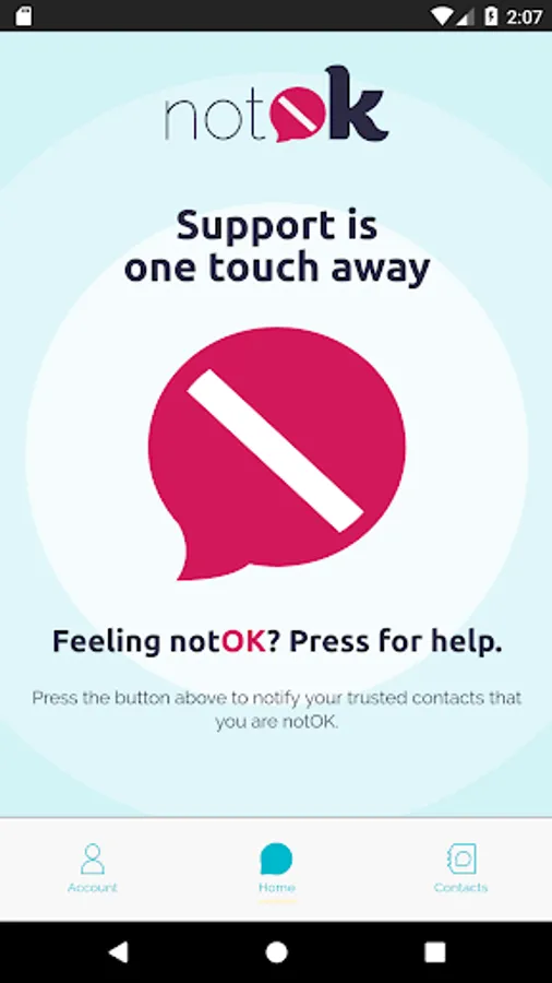The notOK App® takes the guesswork out of asking for help when you're feeling vulnerable. We'll notify your trusted contacts that they've been selected as your support group, so when the time comes and you need to reach out, you'll just have to open the app and press the large, red notOK® button.