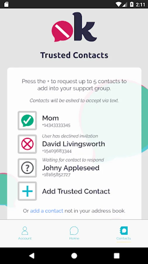 Add up to 5 trusted contacts’ (cellular phone numbers), using your native address book or manually.