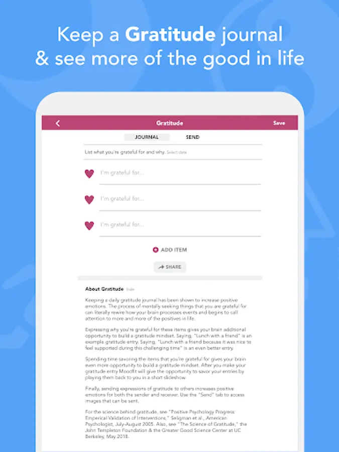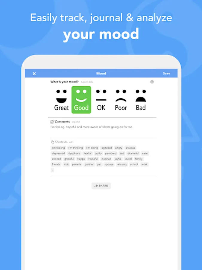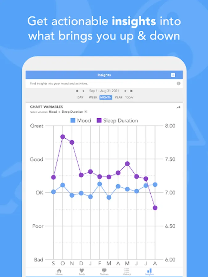 Moodfit provides the most comprehensive set of tools for good mental health, and helps you understand what brings your mood up and down.