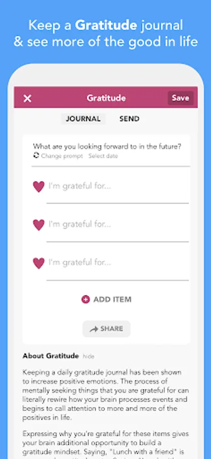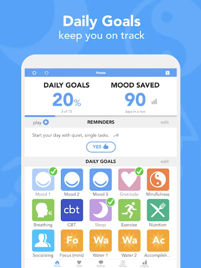 - To work on a set of personalized daily goals that are your daily mental health workout that include good practices like gratitude, breathwork and mindfulness.