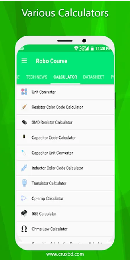 This app is an absolute all in one learning app for robotics, electronics, IoT, Drone making, programming, etc. We are frequently adding more courses. You will be notified about the latest tech news in TECH NEWS section. Besides this, it has tons of electronics calculators, thousands of electronic component datasheet collection, lots of pinout, resources for electronics, etc.