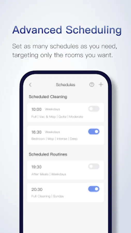Set multiple schedules from hourly to daily to weekly, hitting different rooms with each one. You can clean the kitchen after breakfast and even the whole house when everyone's gone out.