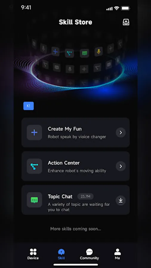 The Skill Store is like an app store for Robosen robots, generating massive amounts of entertainment content. You can explore Skill Store and experience infinite gameplay possibilities by downloading various skills developed by global creators& developers, such as Create My Fun, Action Center, Open Chat, etc., Share your brilliant ideas with the community or download other players' inspirational creations with just one click.