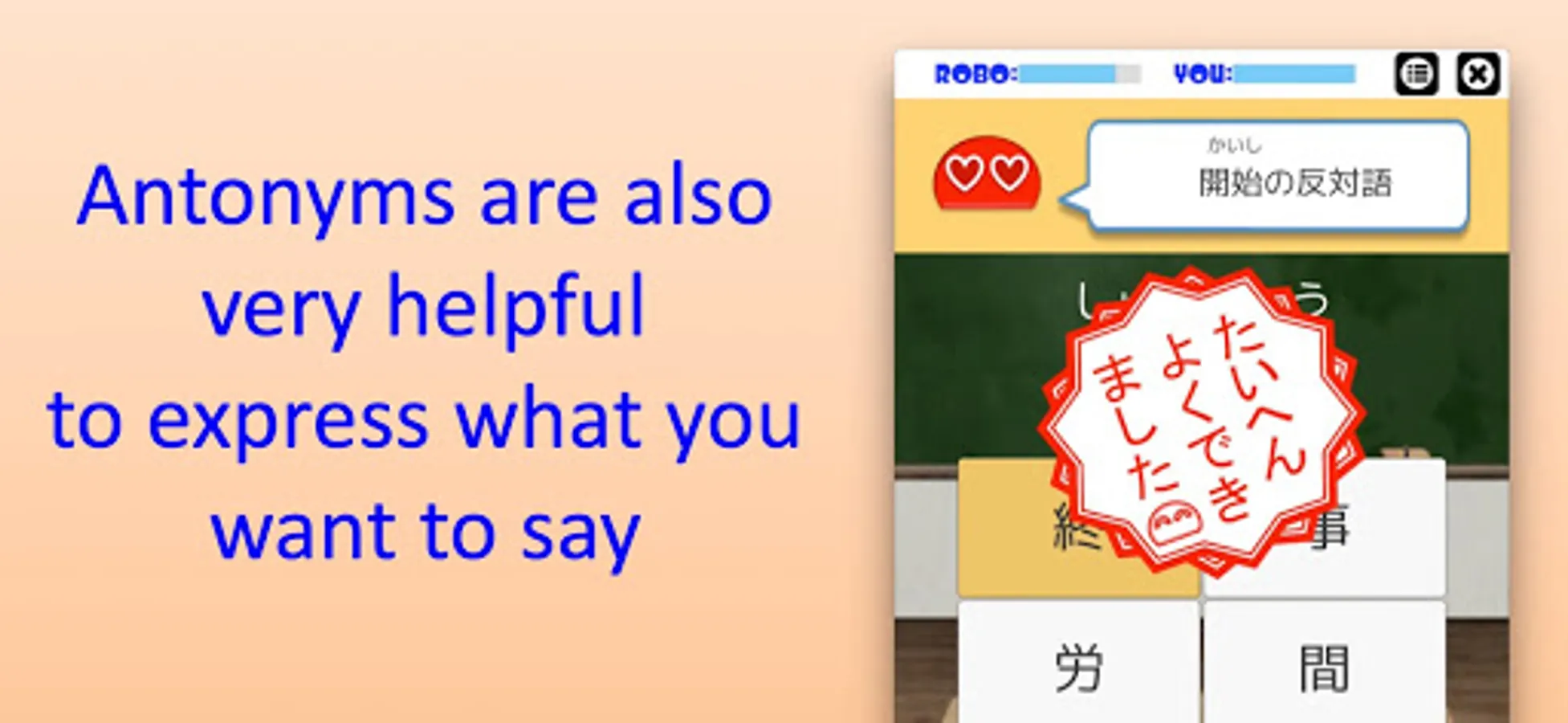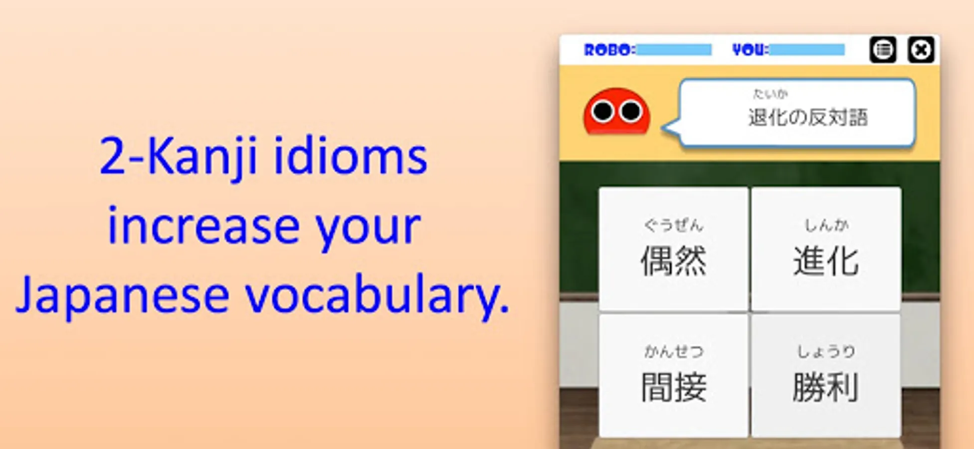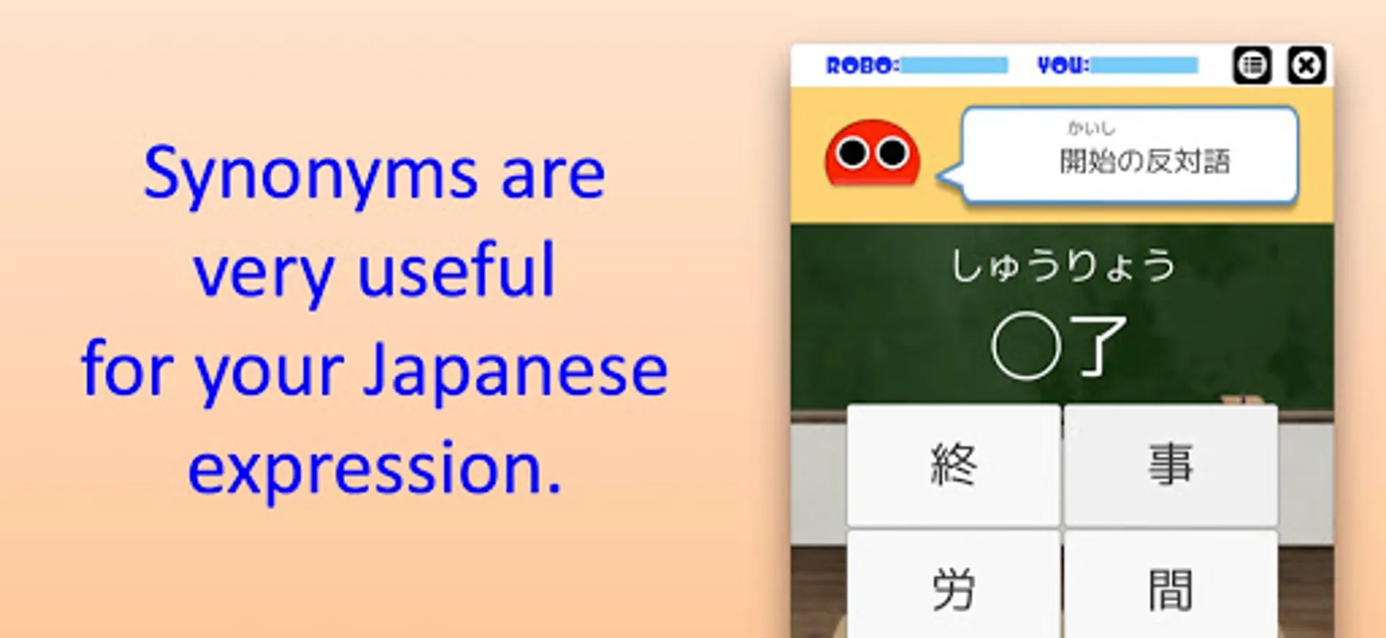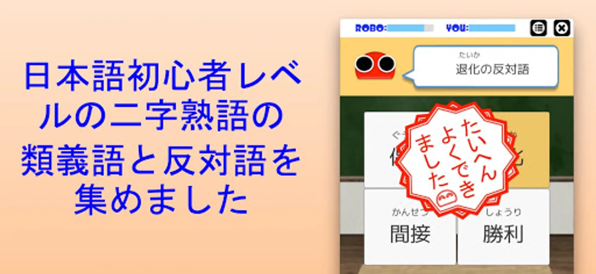 This app has a lot of synonyms and antonyms of two-kanji idioms for Japanese beginner.
