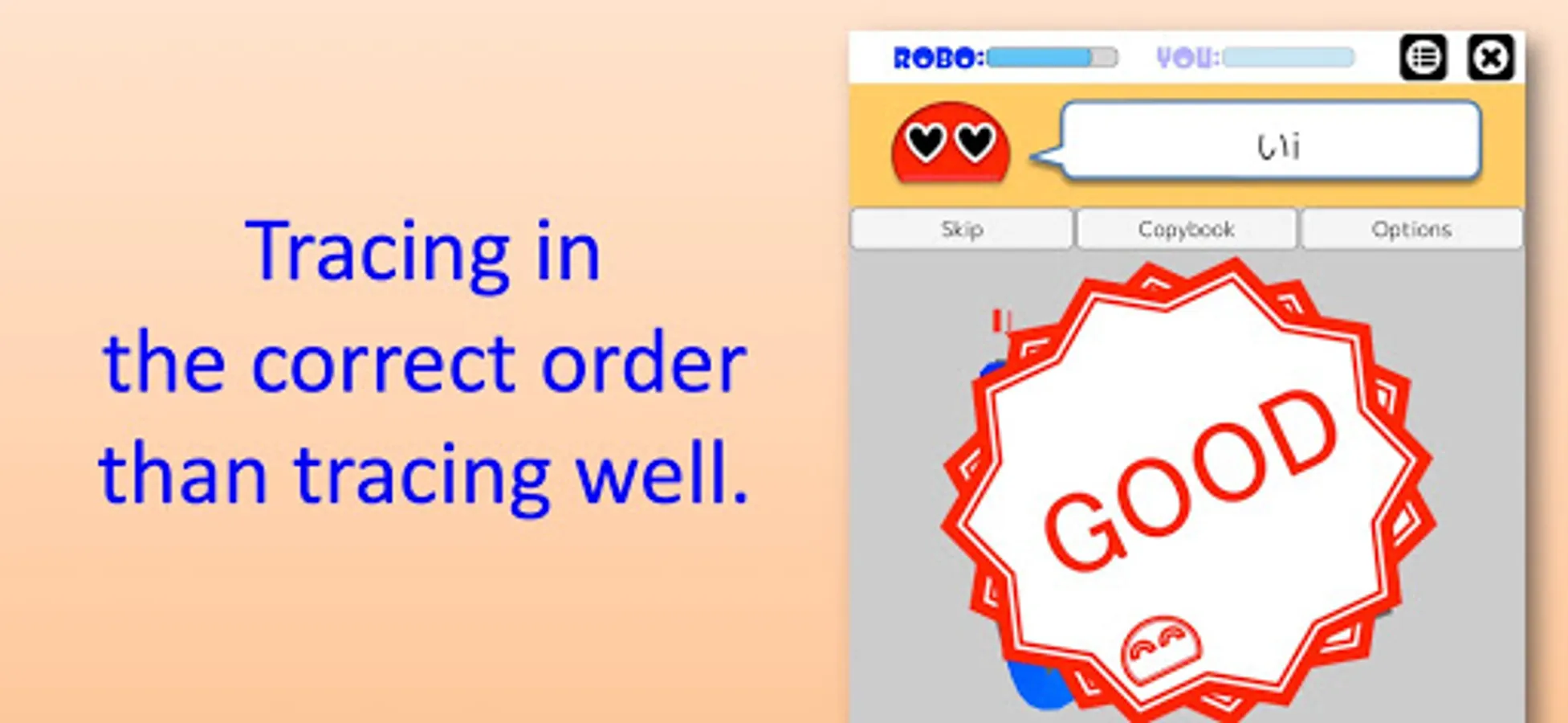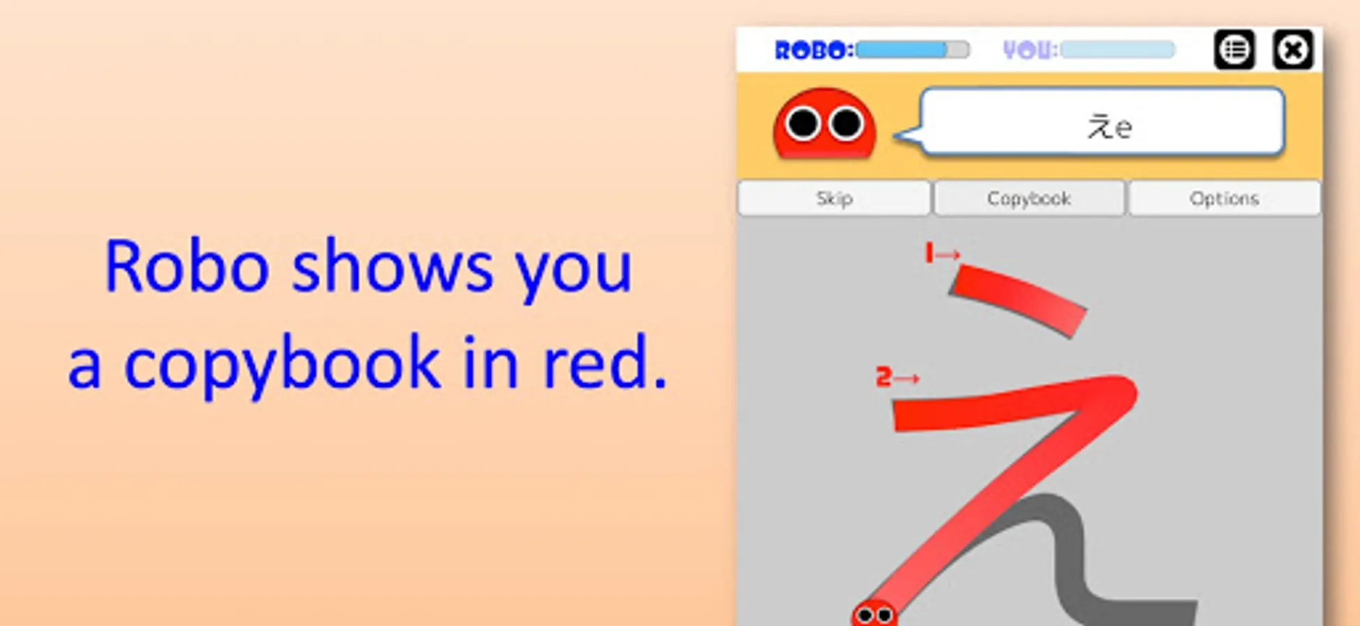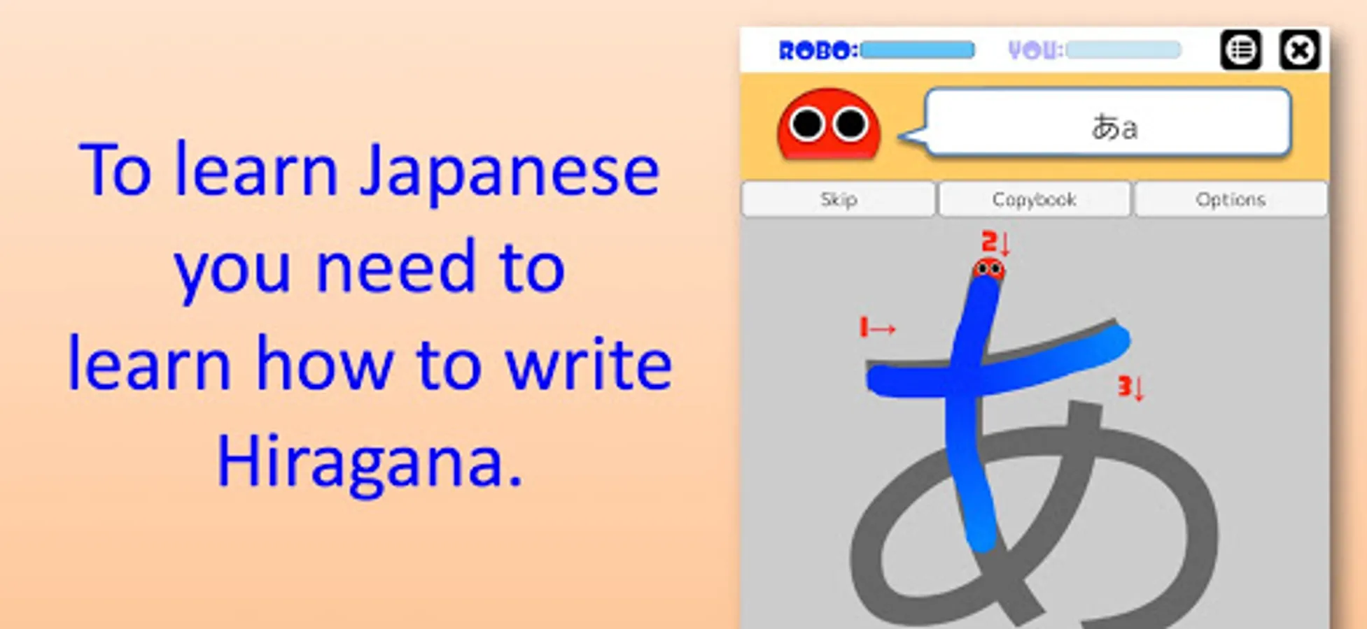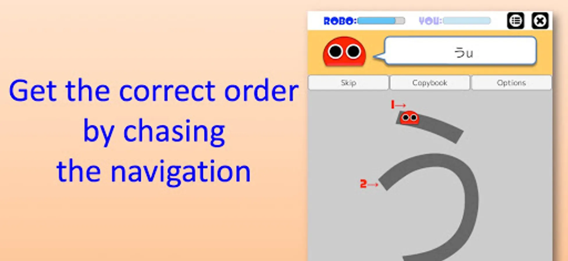 To learn Japanese you need to learn how to write hiragana and katakana. The best way to learn them is to practice writing them over and over but this can be boring. Instead, have fun and use this game to practice the correct way of writing kana - and beat the Robo!