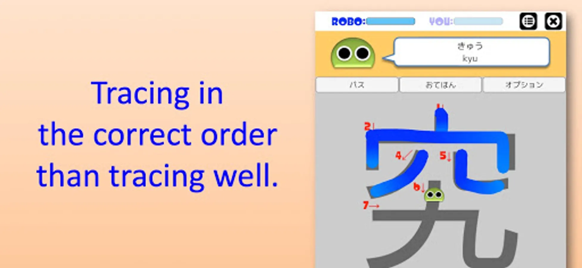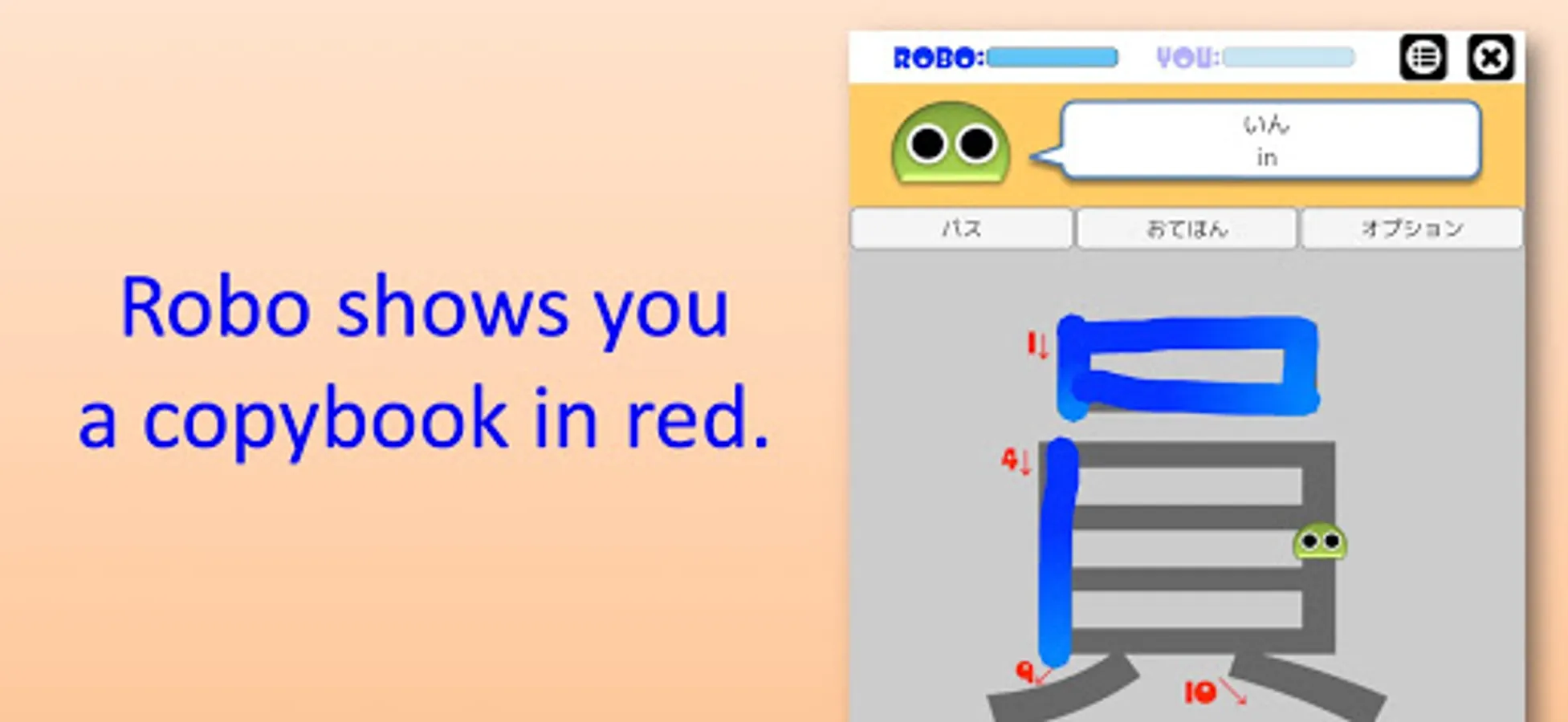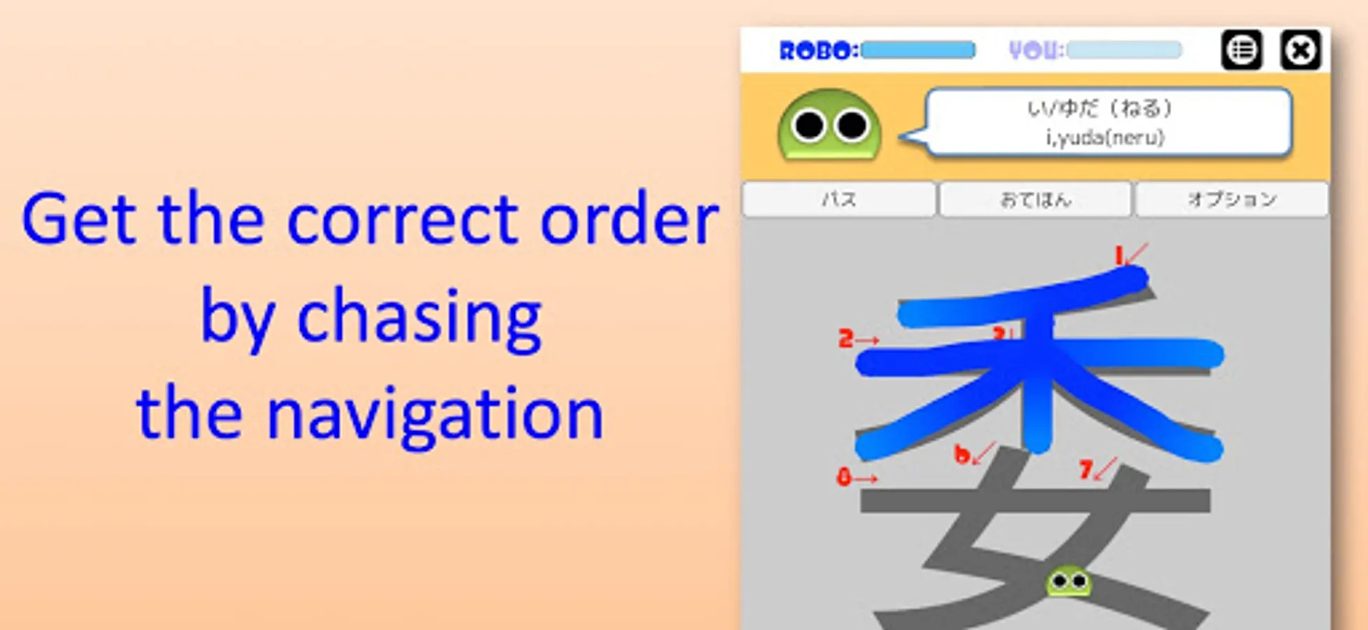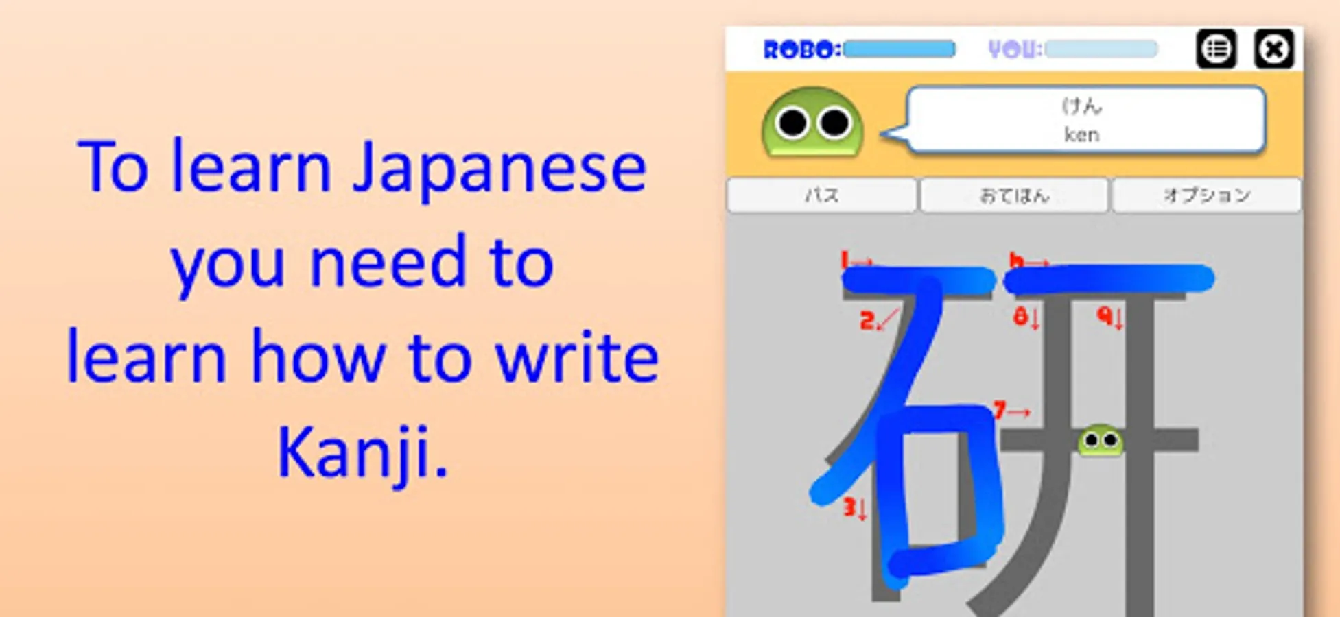 To learn Japanese you need to learn how to write Kanji characters. The best way to learn them is to practice writing them over and over but this can be boring. Instead, have fun and use this game to practice the correct way of writing Kanji - and beat the Robo!