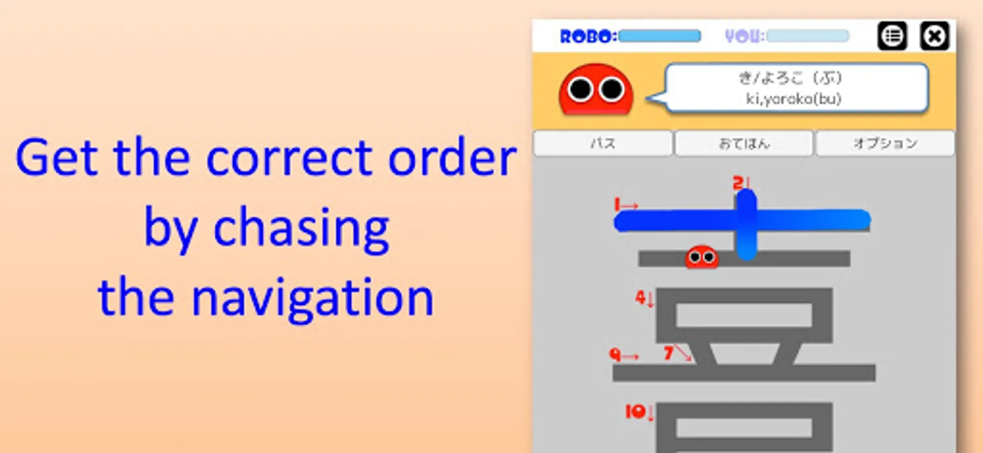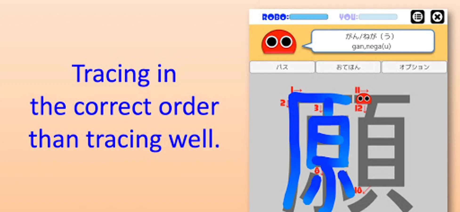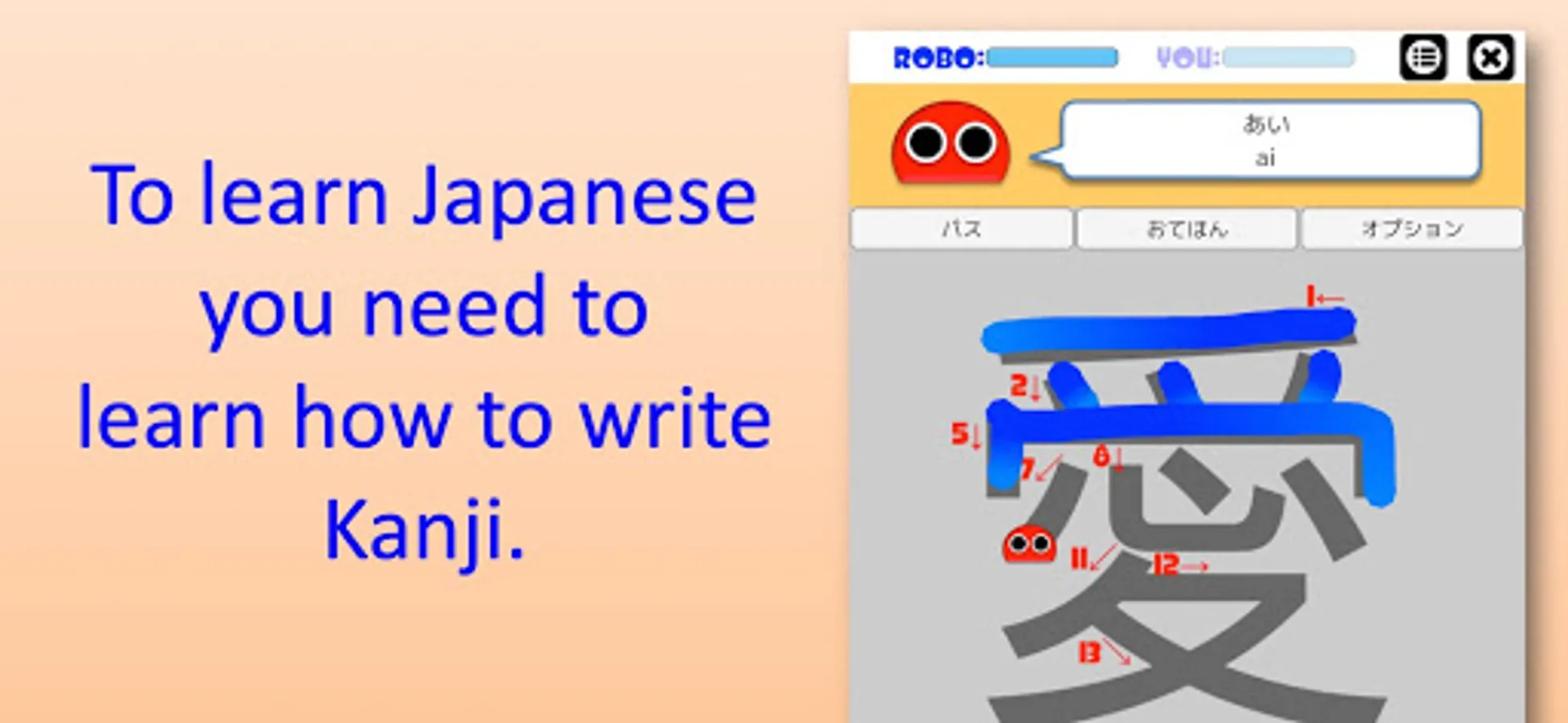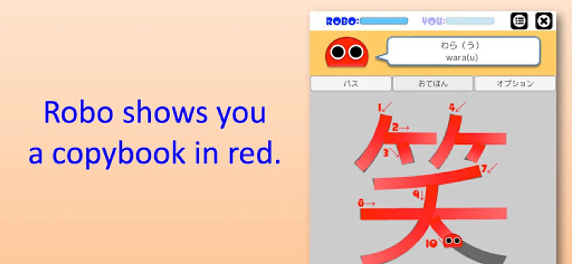 To learn Japanese you need to learn how to write Kanji characters. The best way to learn them is to practice writing them over and over but this can be boring. Instead, have fun and use this game to practice the correct way of writing Kanji - and beat the Robo!