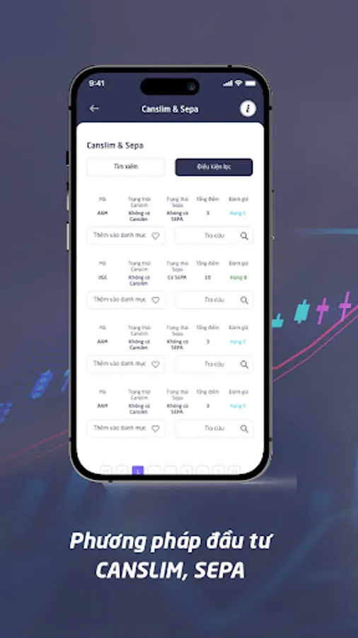 + Apply famous investment and analysis methods such as CANSLIM, SEPA, VSA investment methods, etc.