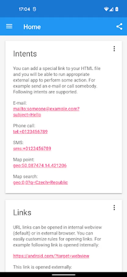 • Intents for opening external apps (e-mail, sms, phone call, map, store, social networks)