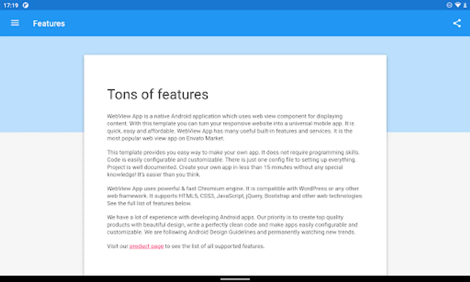 WebView App is a native Android application which uses web view component for displaying content. With this template you can turn your responsive website into a universal mobile app. It is quick, easy and affordable. WebView App has many useful built-in features and services. It is the most popular web view app on Envato Market.