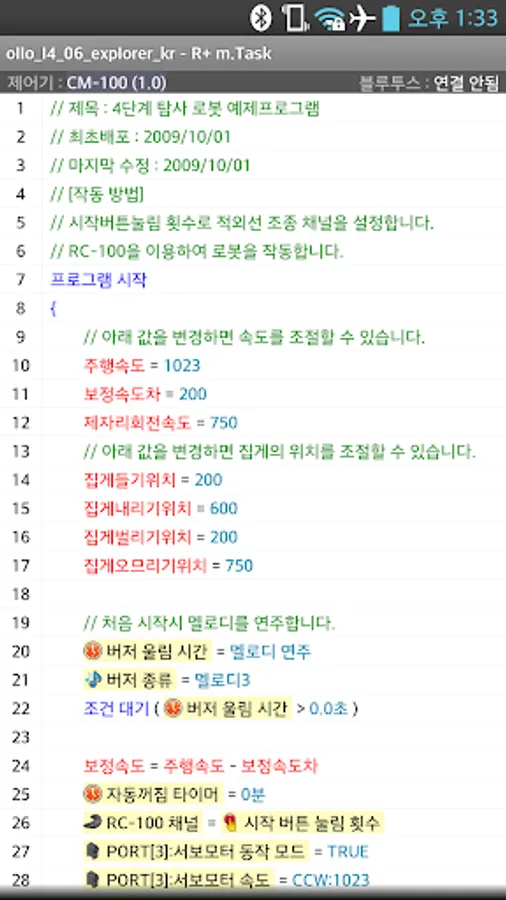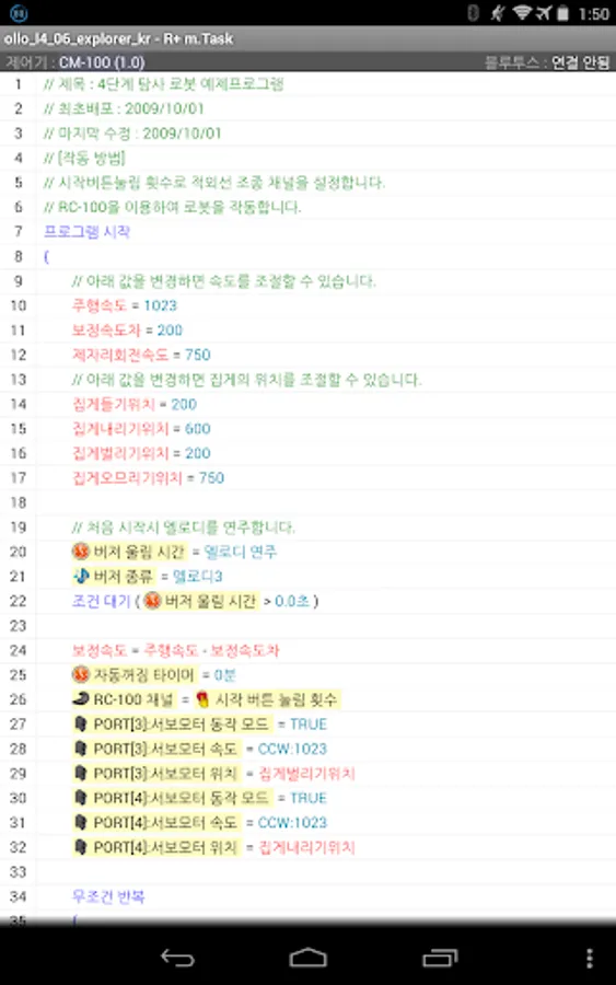 R+m.Task is a software designed for mobile device to program robots (OLLO, DREAM, SMART, STEM, BIOLOID) developed by ROBOTIS Co., Ltd.