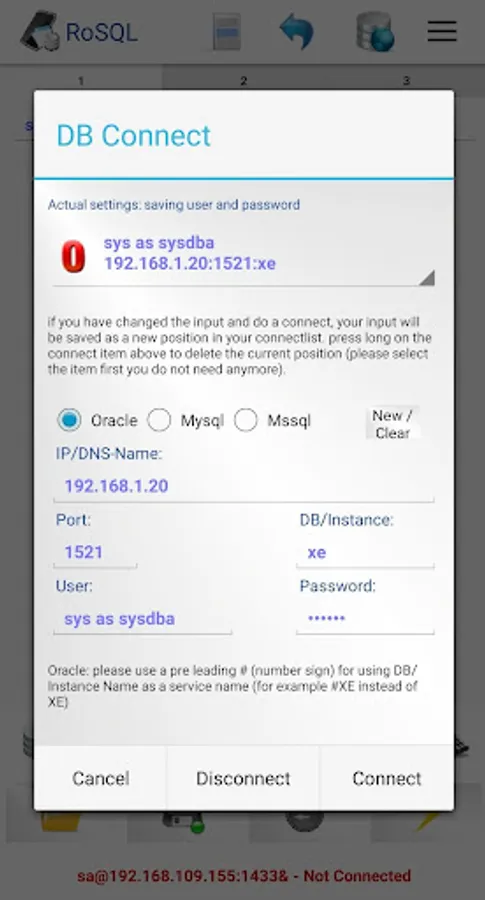 There is a problem (ORA-12705) with NLS (Oracle and thin client) for some countries. if your phone or tablet has a language (for example Cyrillic) , that is not supported, you can try to change the locale in the settings-window to "US" (checkbox for a US default connection). it seems to be a oracle express problem, on tests with oracle standard/enterprise databases i do not have this connect errors.