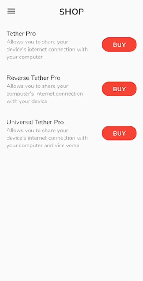 You can try it free for three days! When your free trial ends, you can purchase Tether Pro for unlimited tethering, Reverse Tether Pro for unlimited reverse tethering, or Universal Tether Pro to get both at a discounted price.