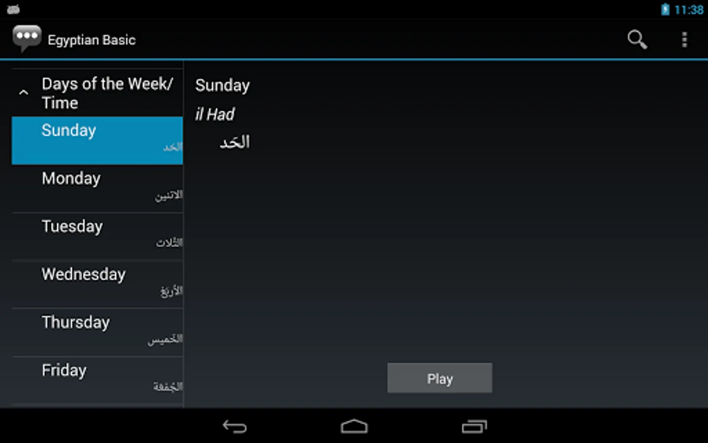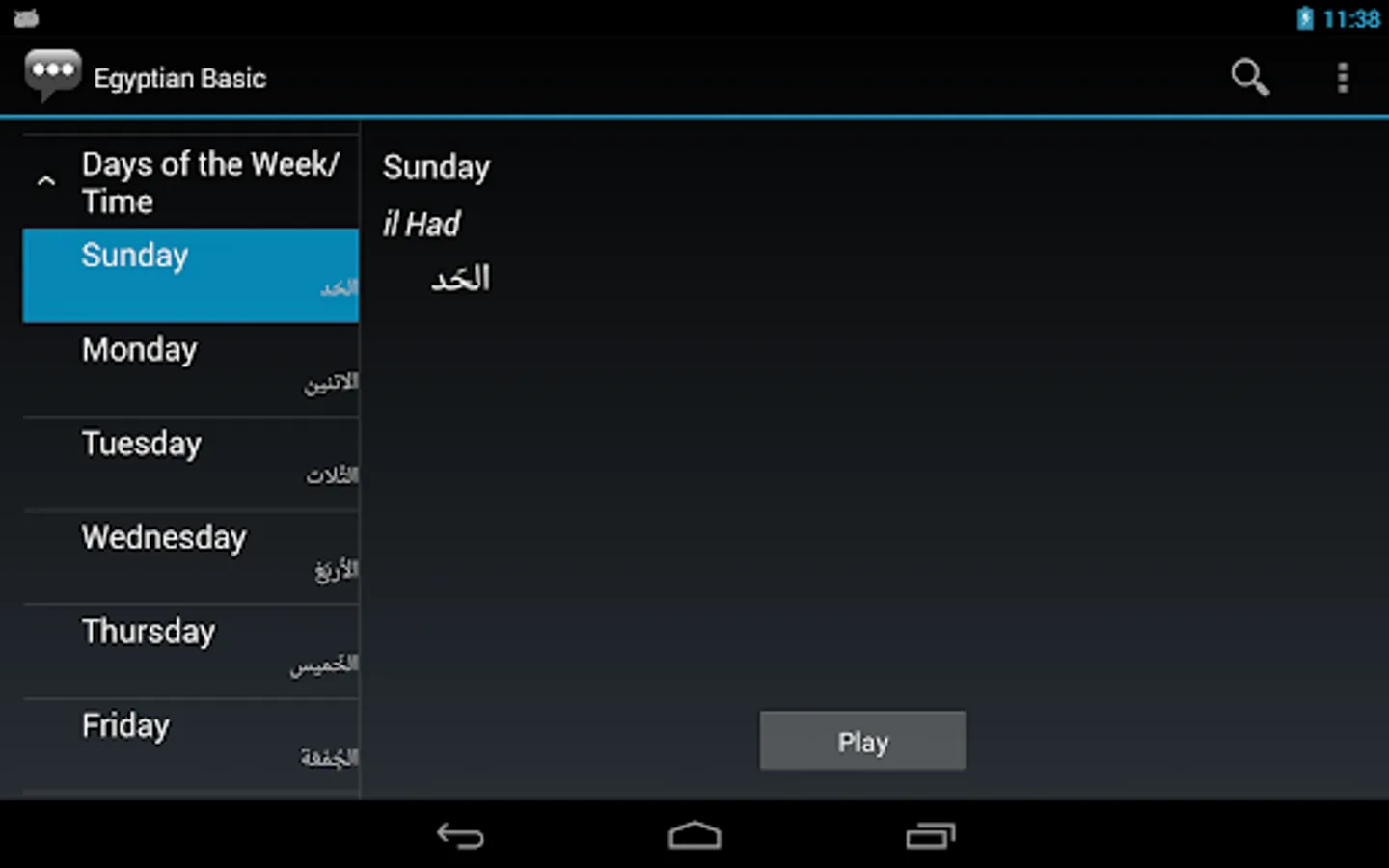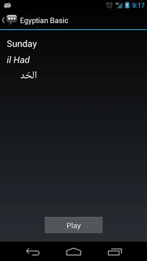 3. On the phrase detail page, the Egyptian phrase is shown alongside its pronunciation and the equivalent English phrase. Press the Play button to hear the audio pronunciation by a native speaker.