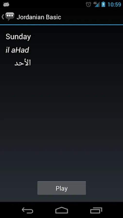 3. On the phrase detail page, the Jordanian phrase is shown alongside its pronunciation and the equivalent English phrase. Press the Play button to hear the audio pronunciation by a native speaker.