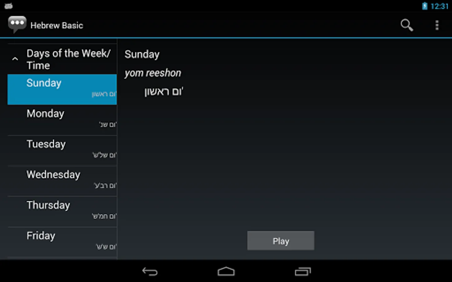 3. On the phrase detail page, the Hebrew phrase is shown alongside its pronunciation and the equivalent English phrase. Press the Play button to hear the audio pronunciation by a native speaker.
