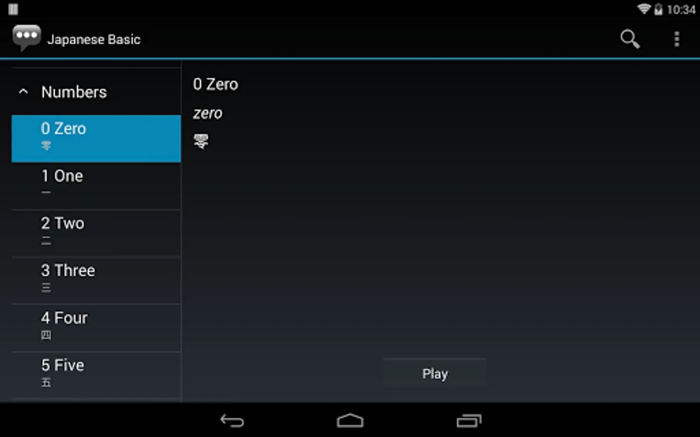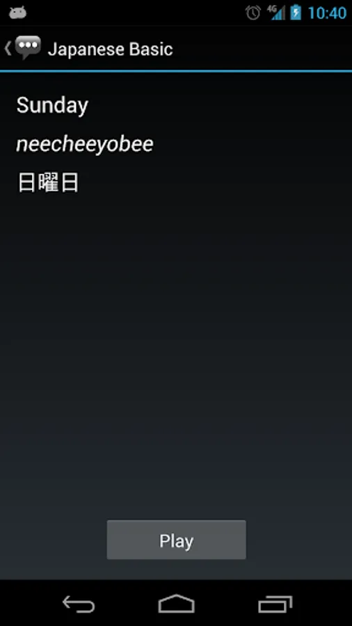 3. On the phrase detail page, the Japanese phrase is shown alongside its pronunciation and the equivalent English phrase. Press the Play button to hear the audio pronunciation by a native speaker.