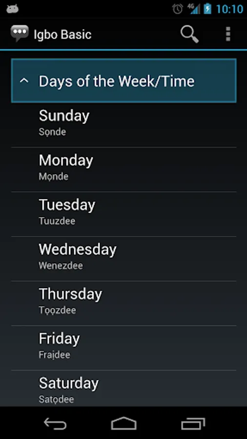 Using this app, you can select an English phrase and view its translation and how to pronounce it in Igbo.