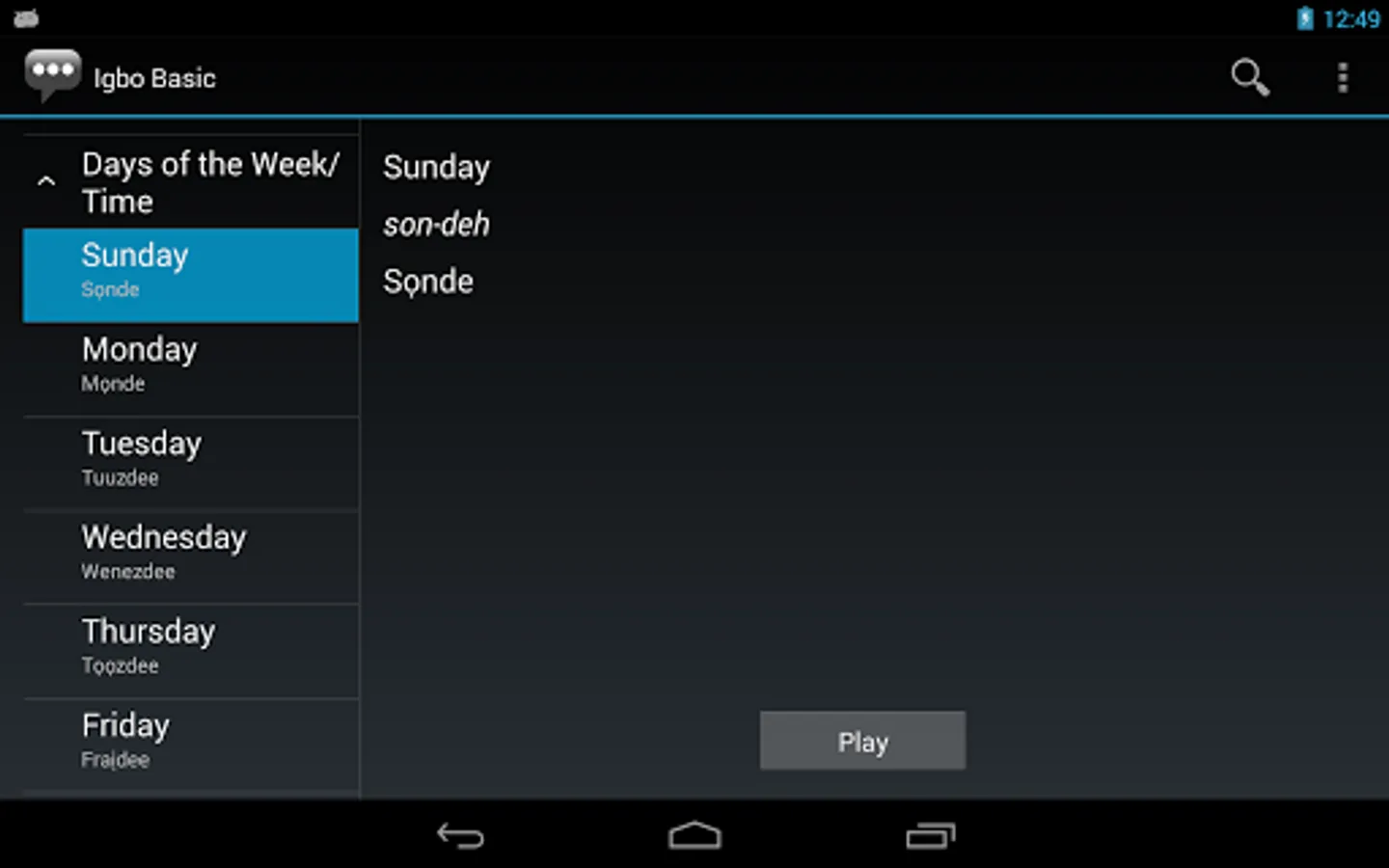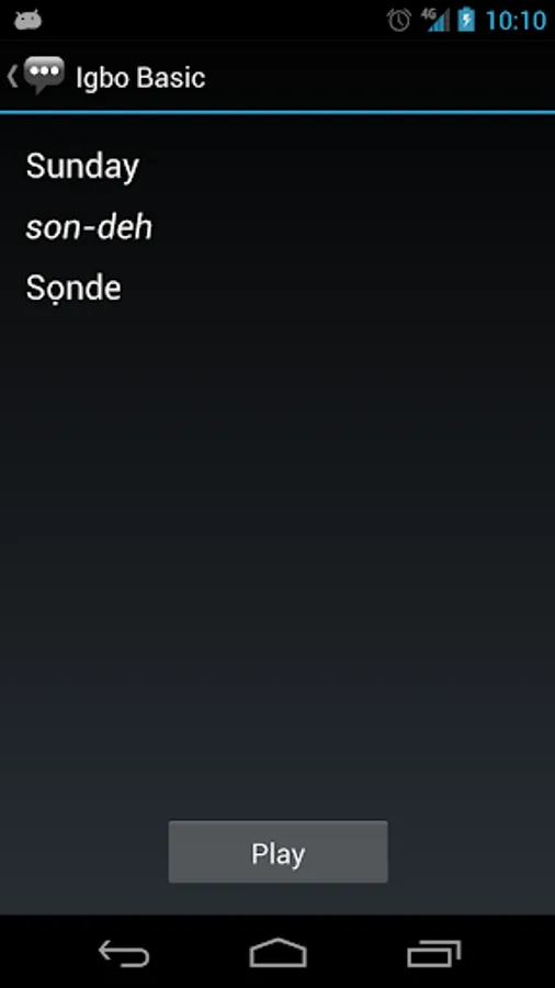 3. On the phrase detail page, the Igbo phrase is shown alongside its pronunciation and the equivalent English phrase. Press the Play button to hear the audio pronunciation by a native speaker.