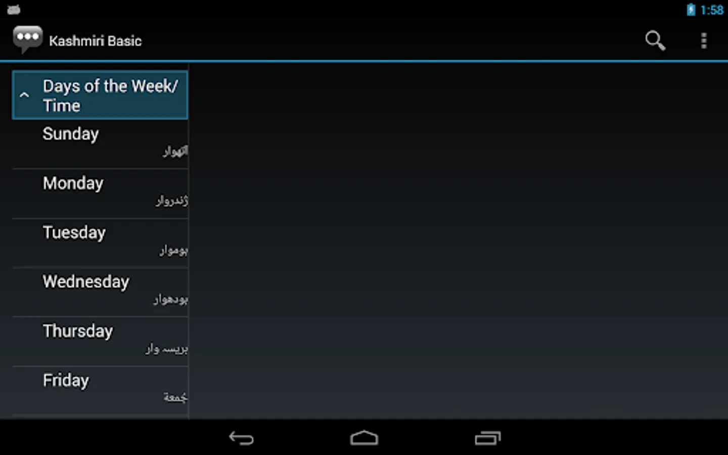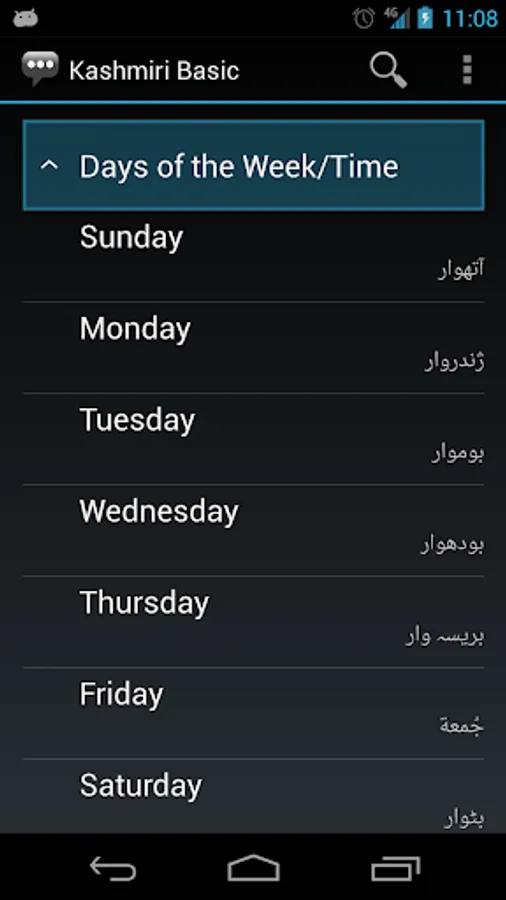 Using this app, you can select an English phrase and view its translation and how to pronounce it in Kashmiri.