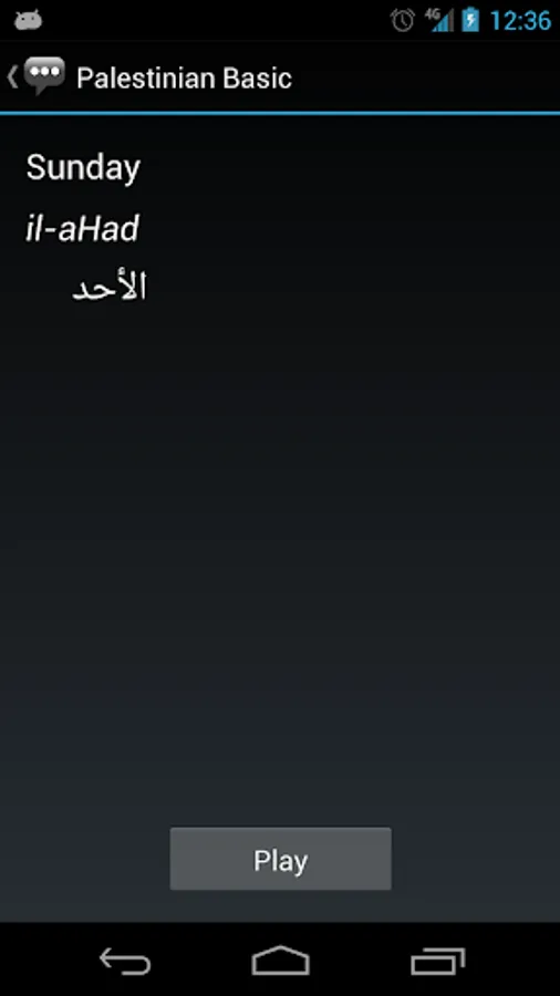 3. On the phrase detail page, the Palestinian phrase is shown alongside its pronunciation and the equivalent English phrase. Press the Play button to hear the audio pronunciation by a native speaker.
