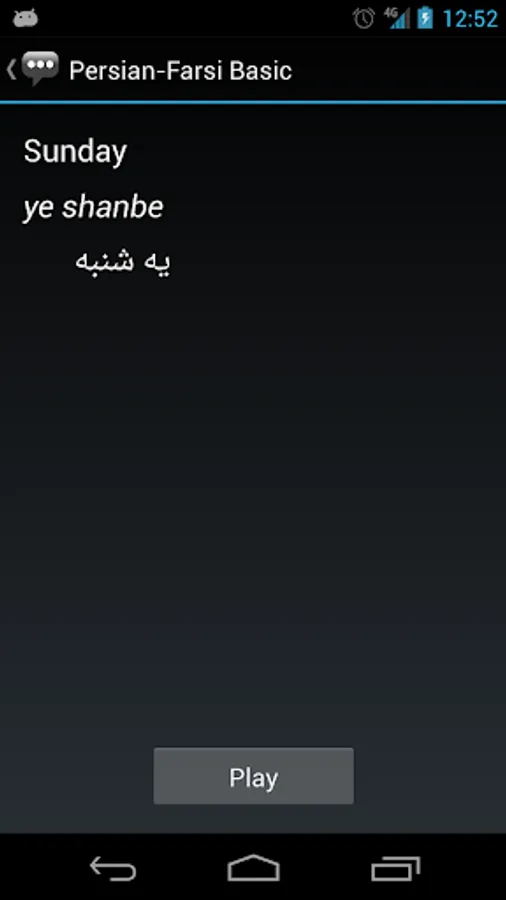 3. On the phrase detail page, the Persian-Farsi phrase is shown alongside its pronunciation and the equivalent English phrase. Press the Play button to hear the audio pronunciation by a native speaker.