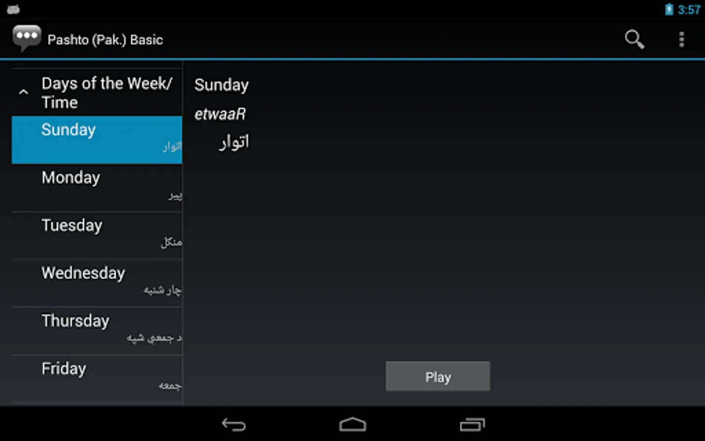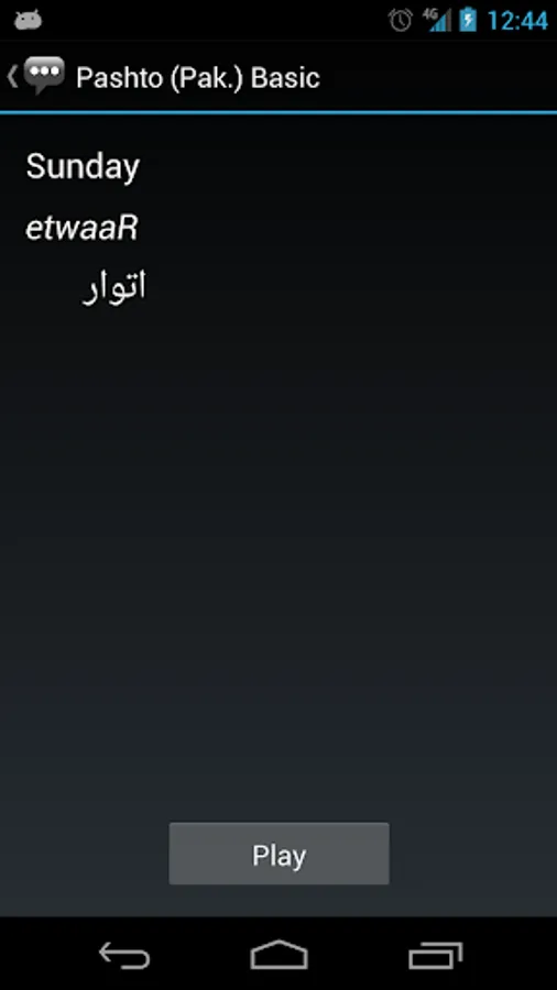 3. On the phrase detail page, the Pashto (Pakistan) phrase is shown alongside its pronunciation and the equivalent English phrase. Press the Play button to hear the audio pronunciation by a native speaker.