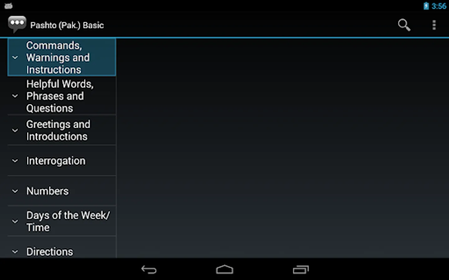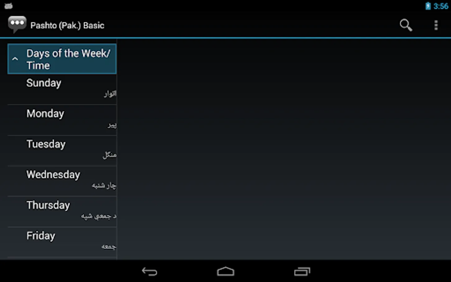 Using this app, you can select an English phrase and view its translation and how to pronounce it in Pashto (Pakistan).