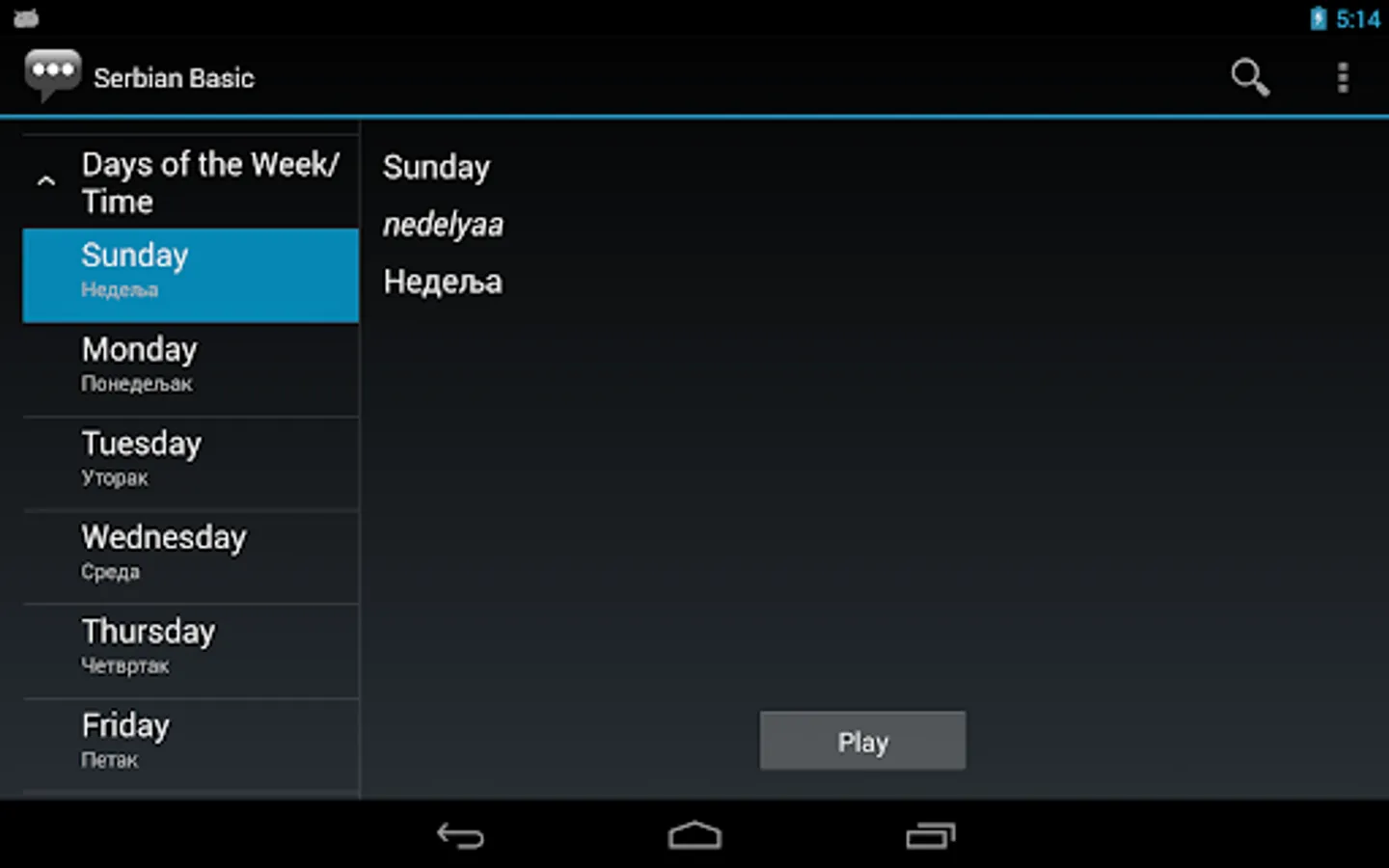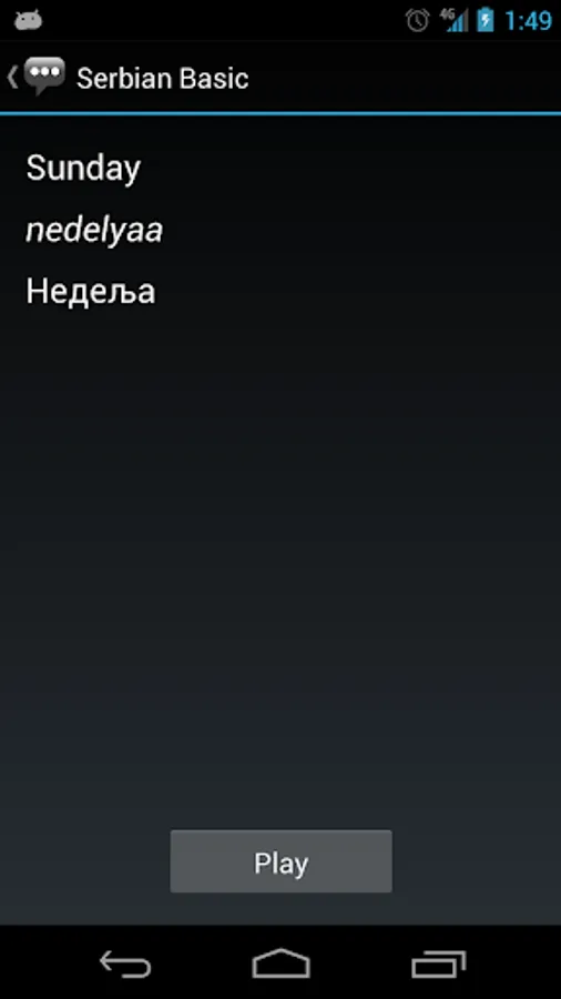 3. On the phrase detail page, the Serbian phrase is shown alongside its pronunciation and the equivalent English phrase. Press the Play button to hear the audio pronunciation by a native speaker.