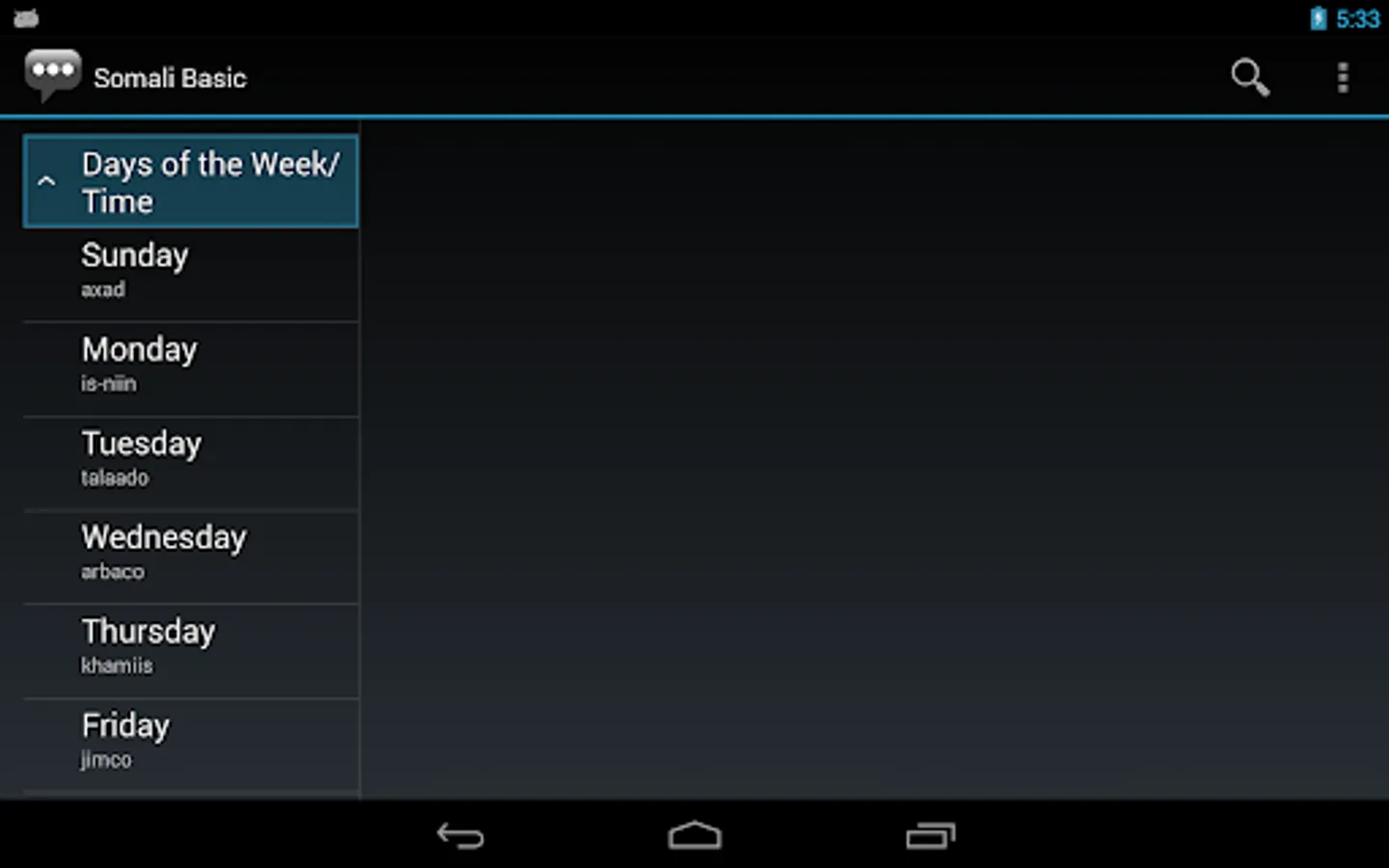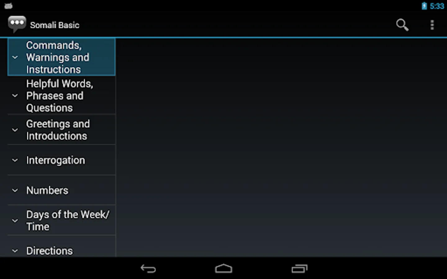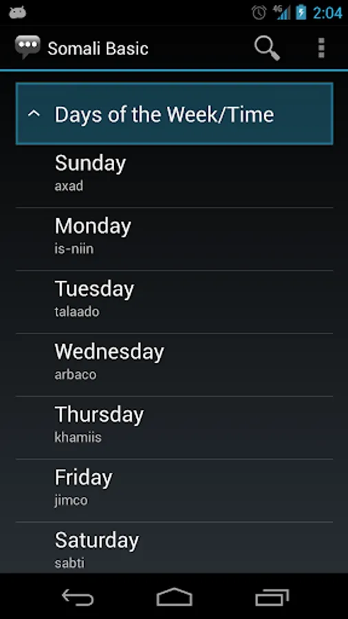 Using this app, you can select an English phrase and view its translation and how to pronounce it in Somali.