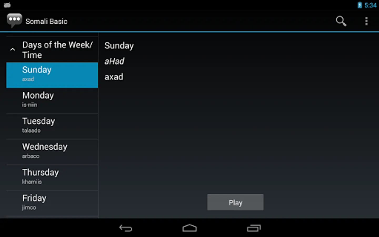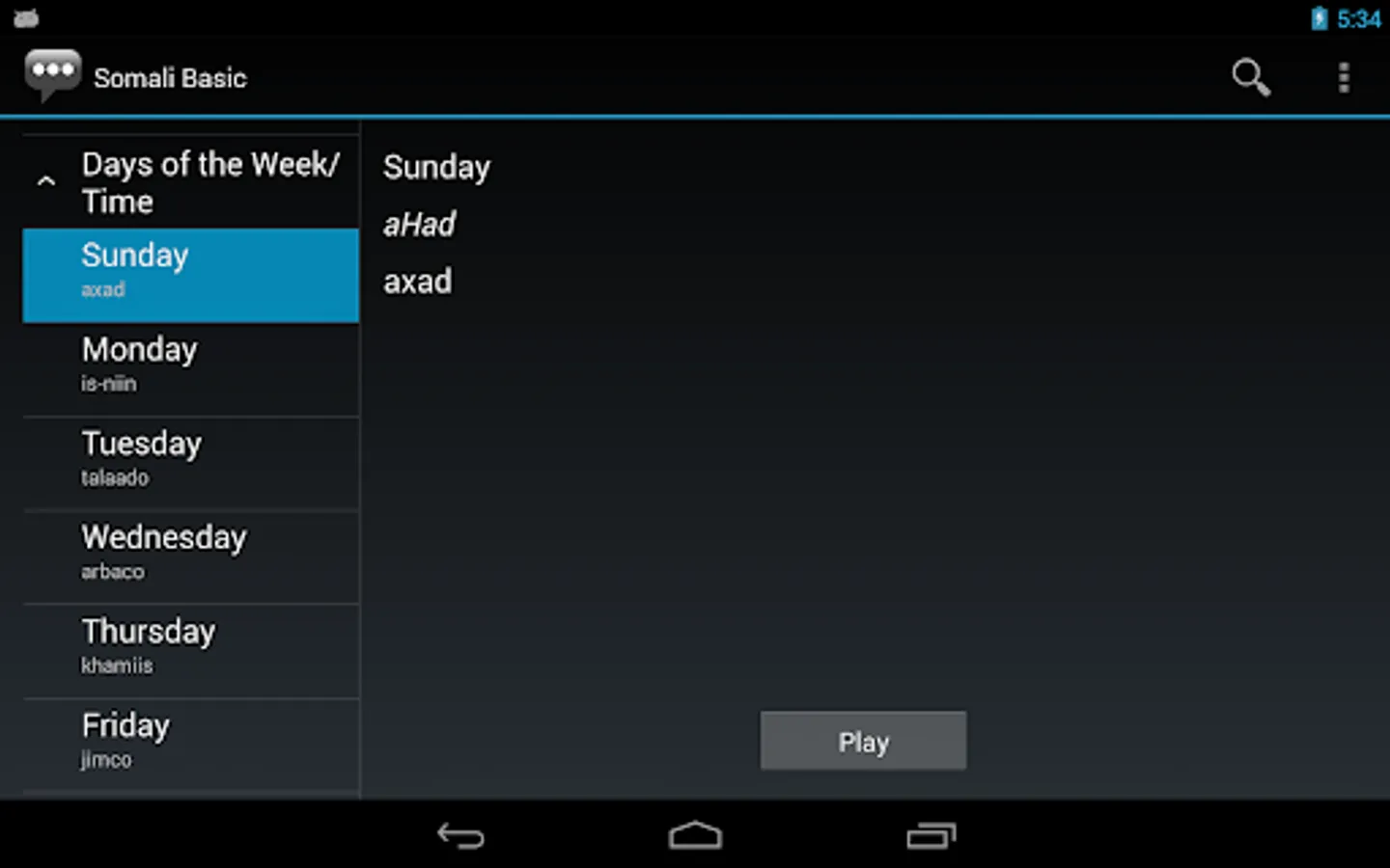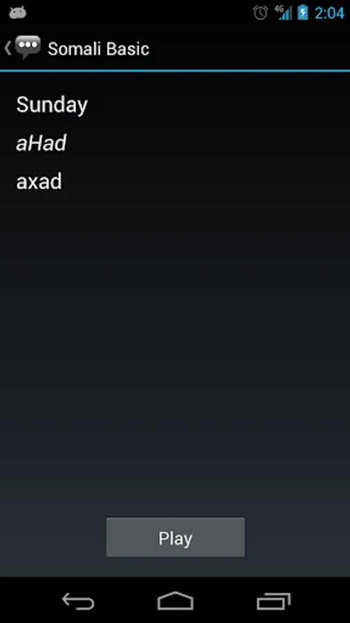 3. On the phrase detail page, the Somali phrase is shown alongside its pronunciation and the equivalent English phrase. Press the Play button to hear the audio pronunciation by a native speaker.