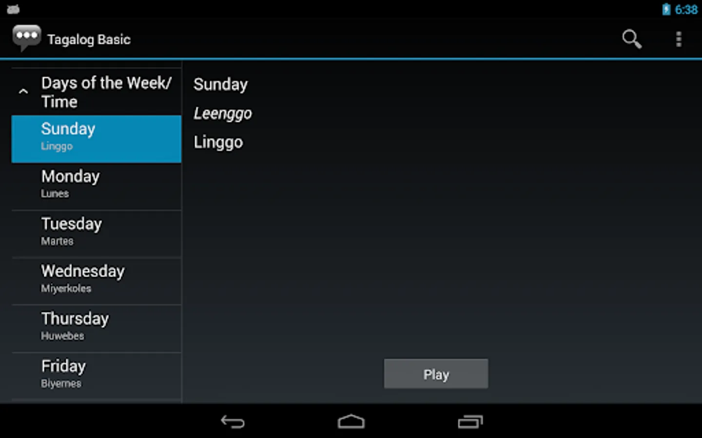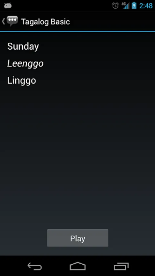 3. On the phrase detail page, the Tagalog phrase is shown alongside its pronunciation and the equivalent English phrase. Press the Play button to hear the audio pronunciation by a native speaker.