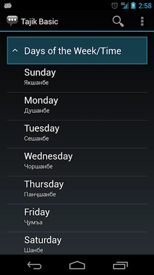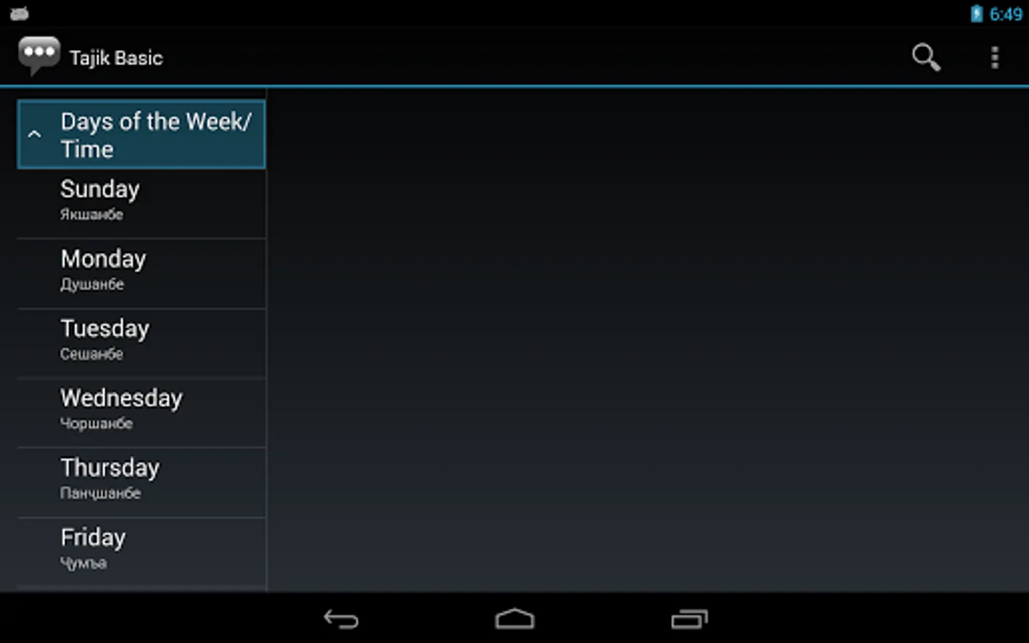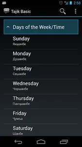Using this app, you can select an English phrase and view its translation and how to pronounce it in Tajik.