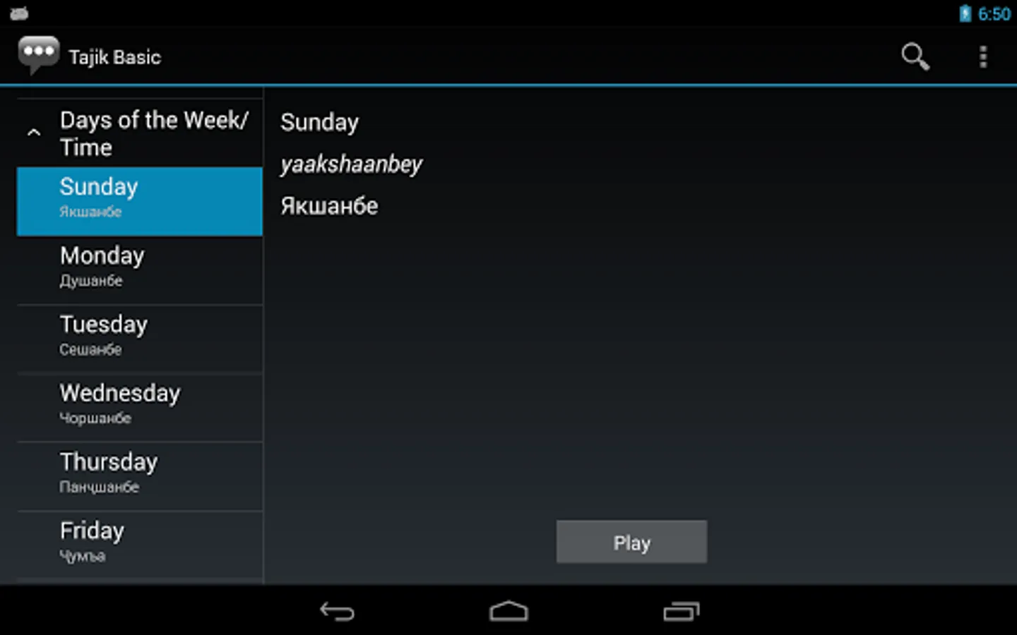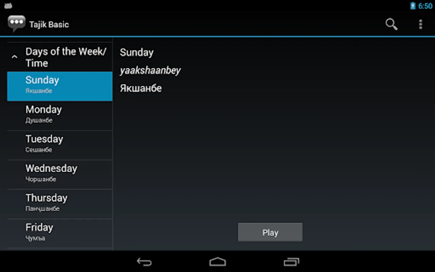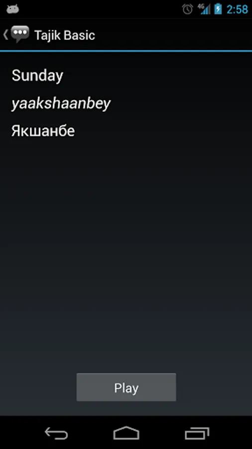 3. On the phrase detail page, the Tajik phrase is shown alongside its pronunciation and the equivalent English phrase. Press the Play button to hear the audio pronunciation by a native speaker.