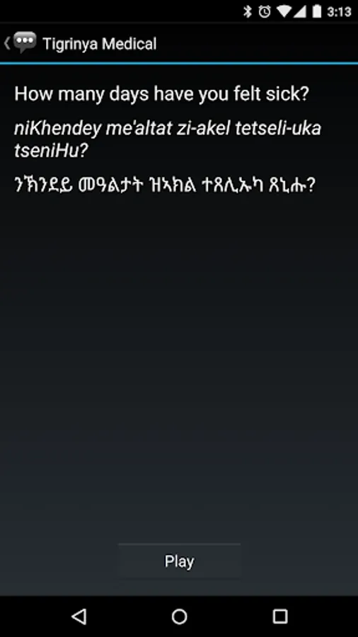 3. On the phrase detail page, the Tigrinya phrase is shown alongside its pronunciation and the equivalent English phrase. Press the Play button to hear the audio pronunciation by a native speaker.
