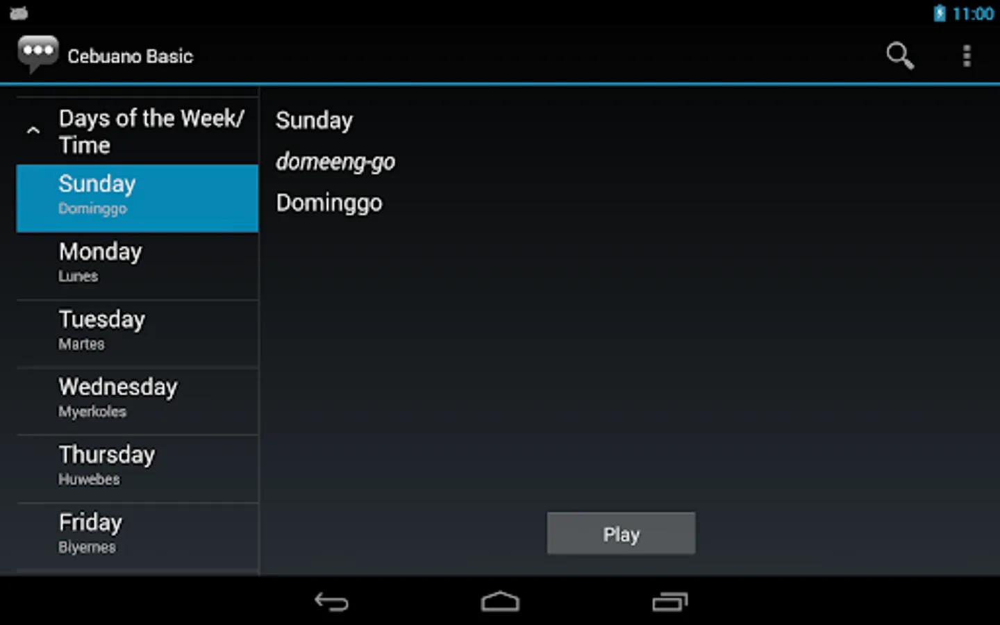 3. On the phrase detail page, the Cebuano phrase is shown alongside its pronunciation and the equivalent English phrase. Press the Play button to hear the audio pronunciation by a native speaker.