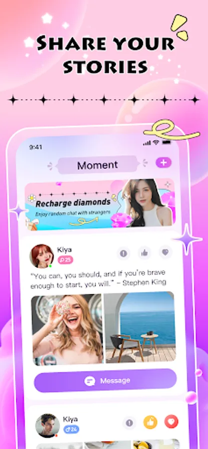 Kiya offers many fun ways to help you interact with our community: Upload photos directly from your phone library, follow to stay connected with your favourite friends, send messages or gift to your friends to make your conversation more fun.