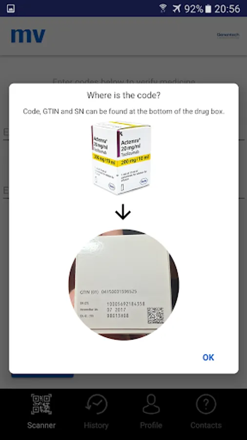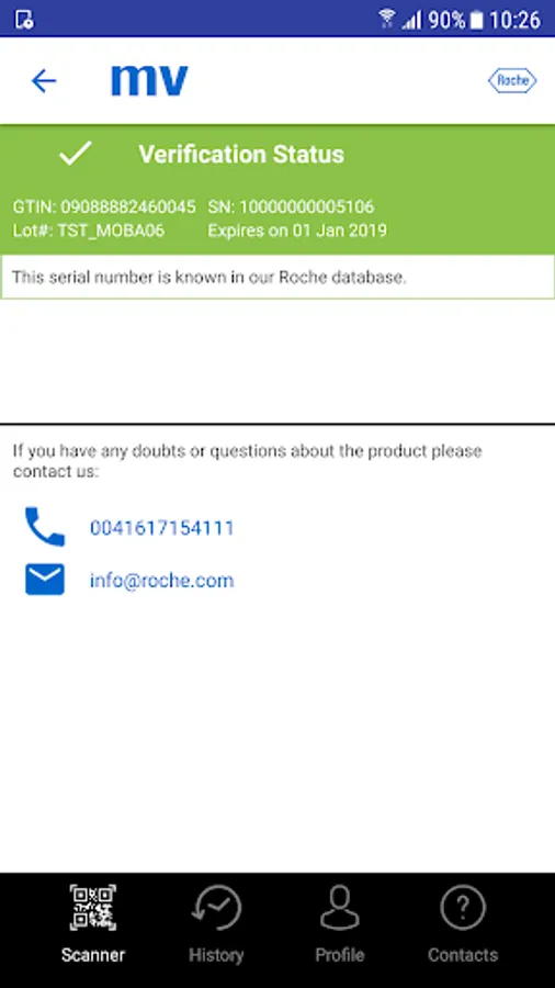 The application gives you also an easy access to the history of your previous verifications and contacts to the Roche helpline, so that you can contact to your local affiliate in case you have any doubts related to the medicine.