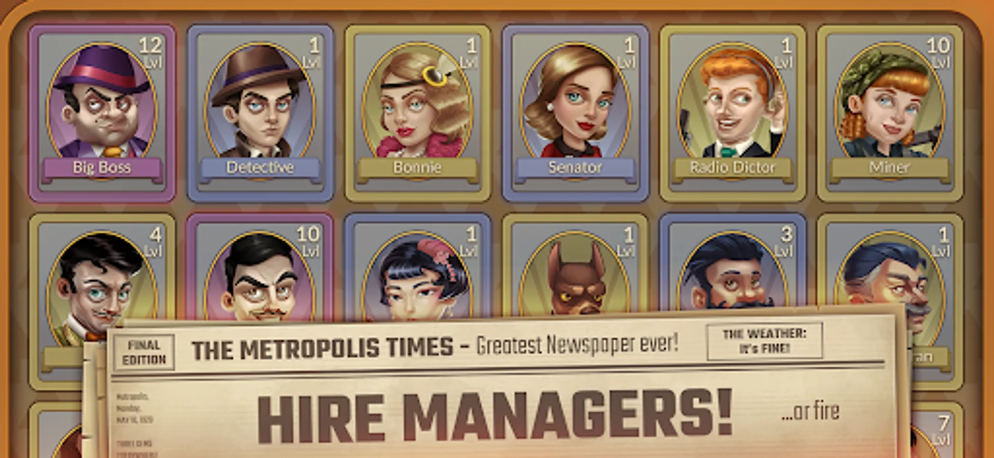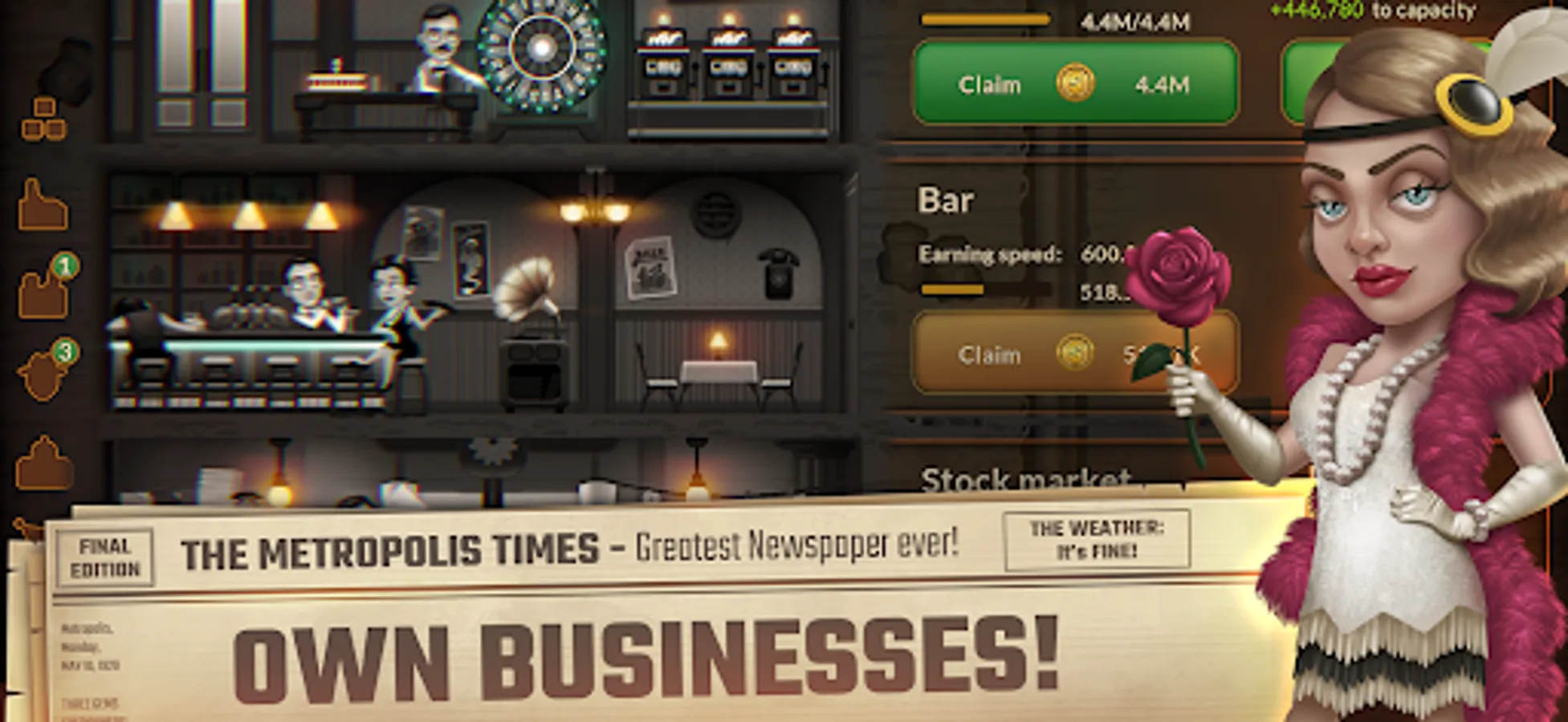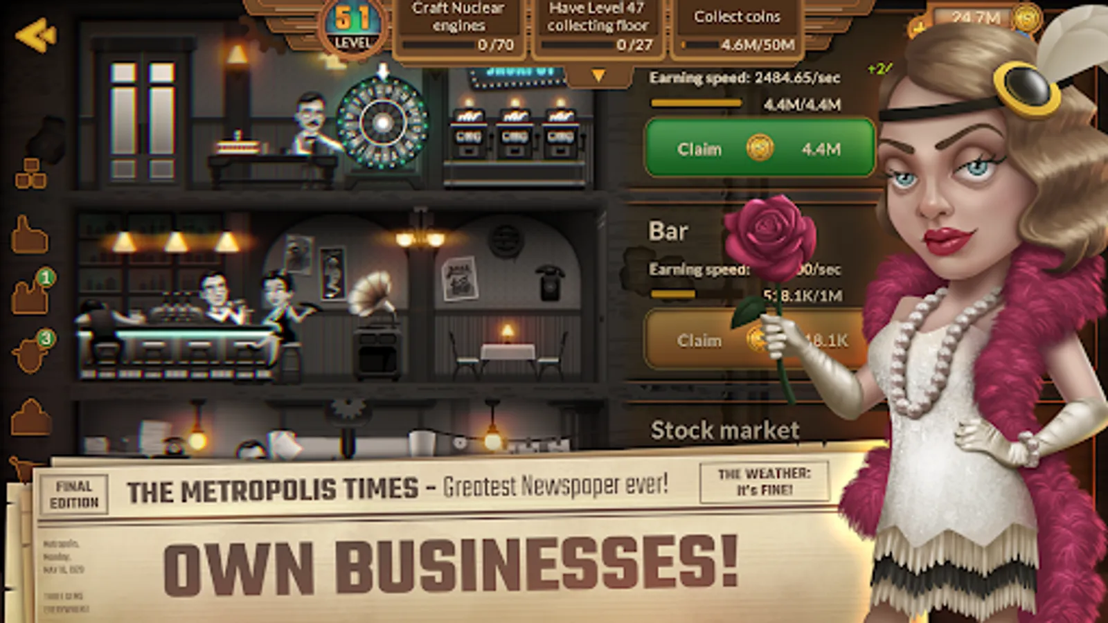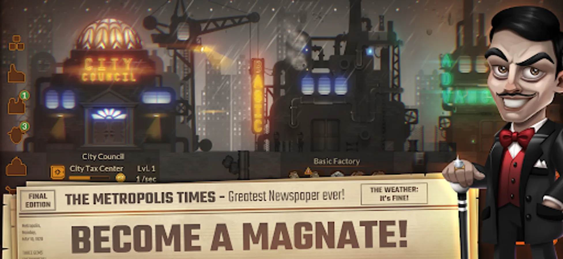 Metropolis Tycoon is a black and white 1920's noir idle game and mining simulator with aliens and tentacles... Don't judge. Whether you are looking for gold rush games or offline idle games to play in your leisure, install this idle empire and have fun.
