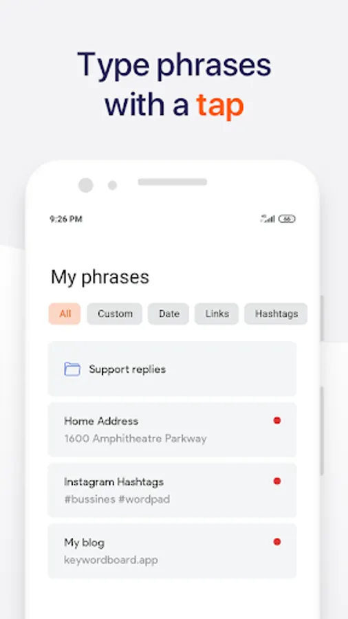 WordPad keyboard helps you create different folders with categorized quick access phrases and customizable quick answers for each situation in your life. That is, with WordPad you could answer a client and a friend in 1-2 seconds.