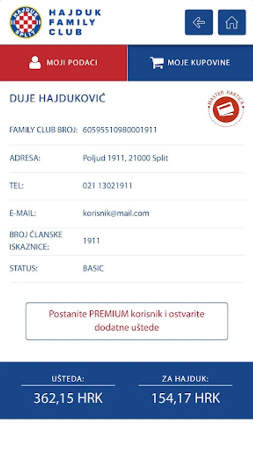 Members of HNK Hajduk become the PREMIUM USERS by entering their membership card number upon registration. Other users of the application have the status of BASIC USERS. By becoming members and registering their membership card number in the application, they automatically become PREMIUM USERS. All users, regardless of their status, get benefits for themselves and/or for HNK Hajduk.