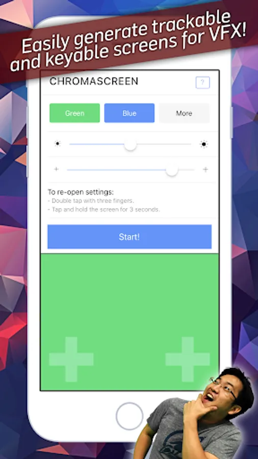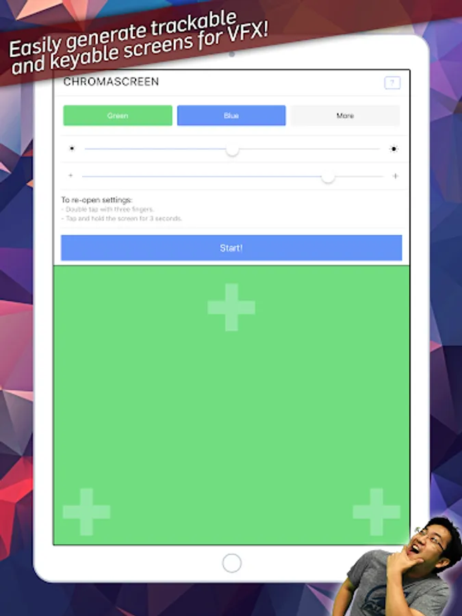 For the discerning VFX supervisor or filmmaker comes RocketJump's Chromascreen - a simple filmmaking tool for phone or tablet screen replaces in post production. With Chromascreen, you can generate a greenscreen or bluescreen background with easily keyable tracking markers and let the poindexters in post deal with it! No more furiously resizing Google Image searches for "green background" while your actors roll their eyes at you!