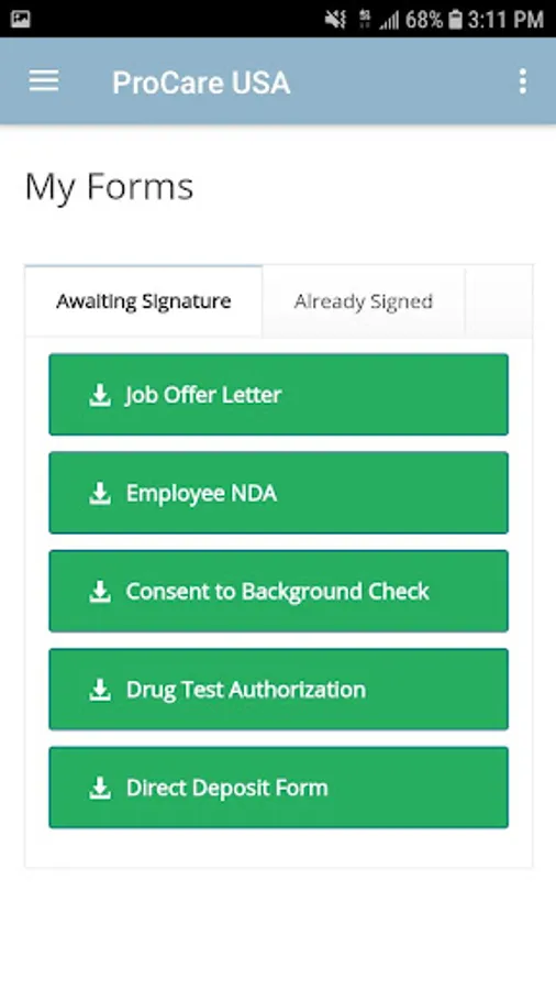 The ProCare USA Android app enables employees to easily submit their timesheets without the need for a fax, digitally sign important company documents, receive important notifications from ProCare USA, view and apply to current job openings, report late/absent, engage in specialized courses/training provided by ProCare USA, shop for uniforms and accessories, easily connect with ProCare USA staff, build and manage their employee profile, receive push notifications & more...