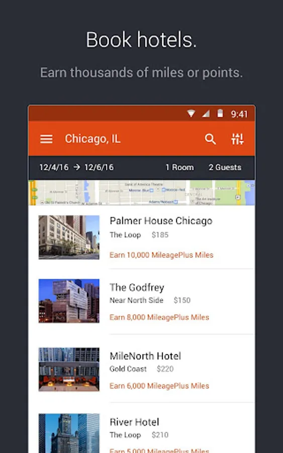 - Sort hotels by price and ratings, view by rewards earned