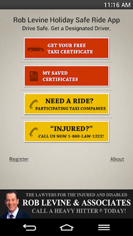 Rob Levine and Associates are proud to offer you our holiday safe driving program. Your safety is our top priority. So if you have been drinking and are under the weather, don’t drive. We are pleased to be able to offer you a free taxi ride home on certain holidays and special occasions.
