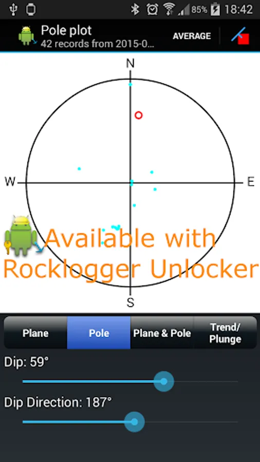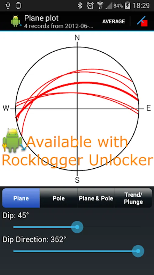 The evaluation version is limited to saving 3 records per 3 minutes, and has the stereonet plotter, KML export and custom basemap features disabled. Rocklogger Unlocker is available for purchase to disable the evaluation version restrictions.